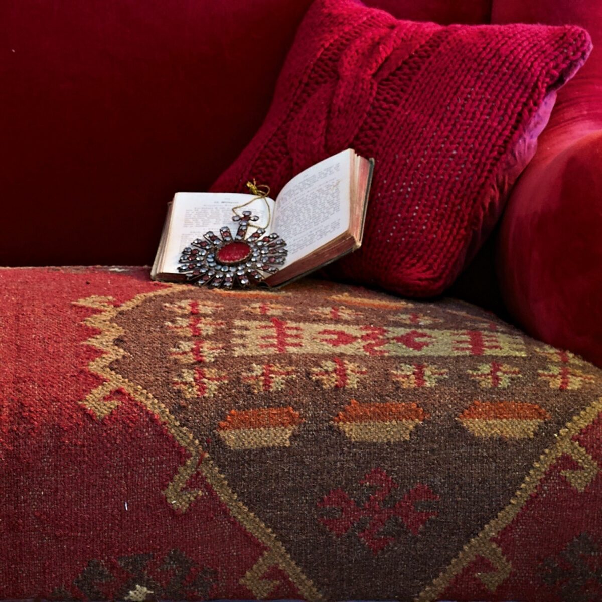 Hochwertig verarbeitet. Ein Kelim als Bezugsstoff schmückt die Sitzfläche. Uni-Bezug aus abriebfestem Samt. Komfortable Schaumstoffpolsterung. Der leuchtend rote […]