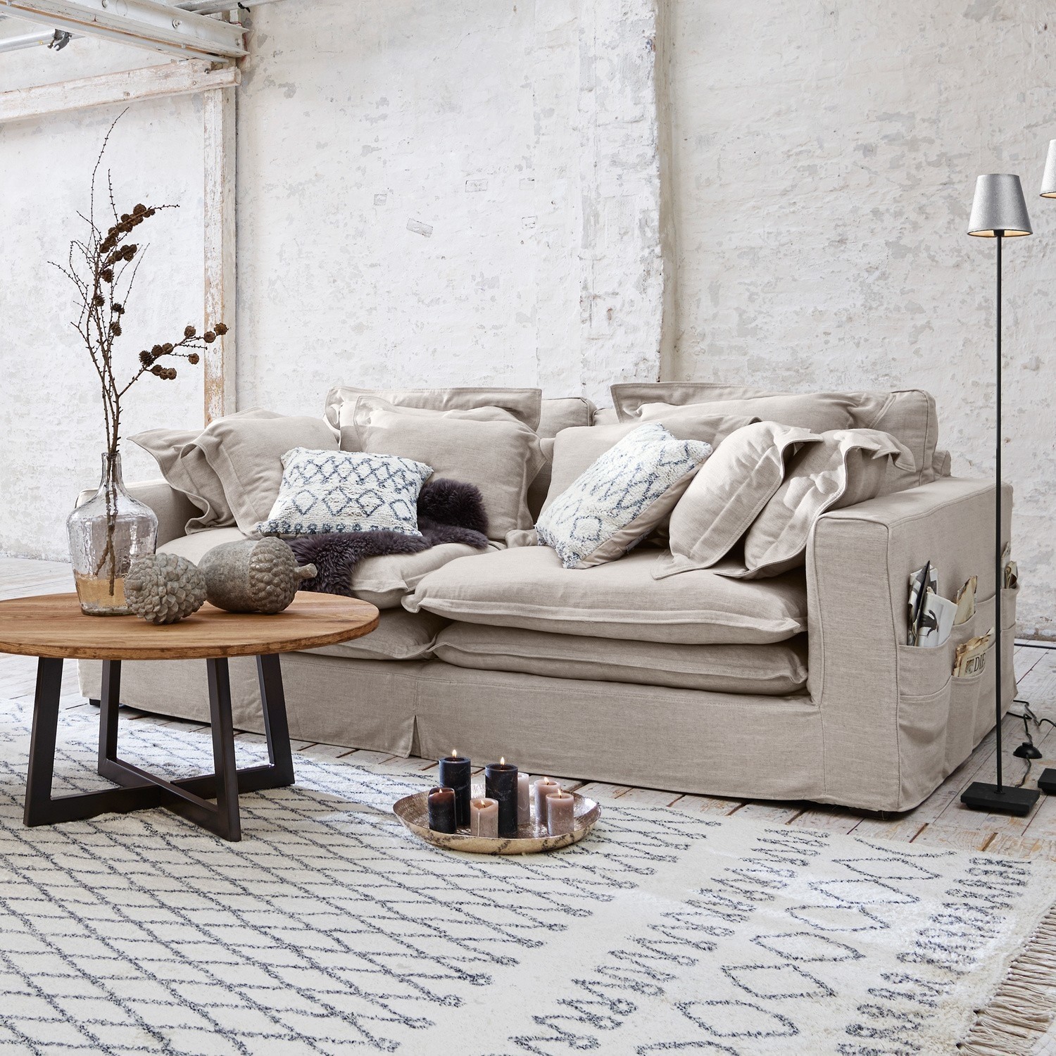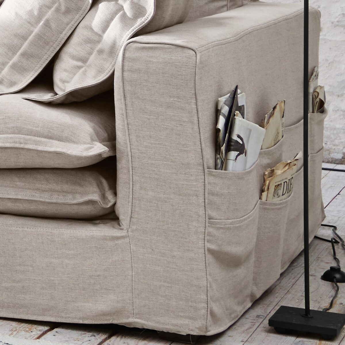 Zu behaupten, es handle sich hier um den Rolls Royce unter den Sofas, wäre sogar noch untertrieben. Es handelt sich um ein wirklich prächtiges Modell, das in Sachen Design, Funktionalität und Komfort seinesgleichen sucht. Da wäre zum einen die großzügig dimensionierten Sitztiefe von 122 Zentimetern, welche zum gemütlichen Verweilen einlädt. Nicht nur ein, sondern gleich zwei Sitzkissen stapeln sich auf jeder Seite, um ein Maximum an Gemütlichkeit zu erreichen. Dazu kommen zwei Rückenkissen und neun Zierkissen, die sich den eigenen Wünschen entsprechend platzieren lassen. Diese Couch ist quasi eine paradisische Liegewiese. Das Gestell ist aus robustem Tannenholz gezimmert und formstabil mit Federkern gepolstert, der Bezug ist abnehmbar. Smartes Detail: Seitlich sind Fächer angebracht für TV-Zeitschriften, Fernbedienungen und so weiter.