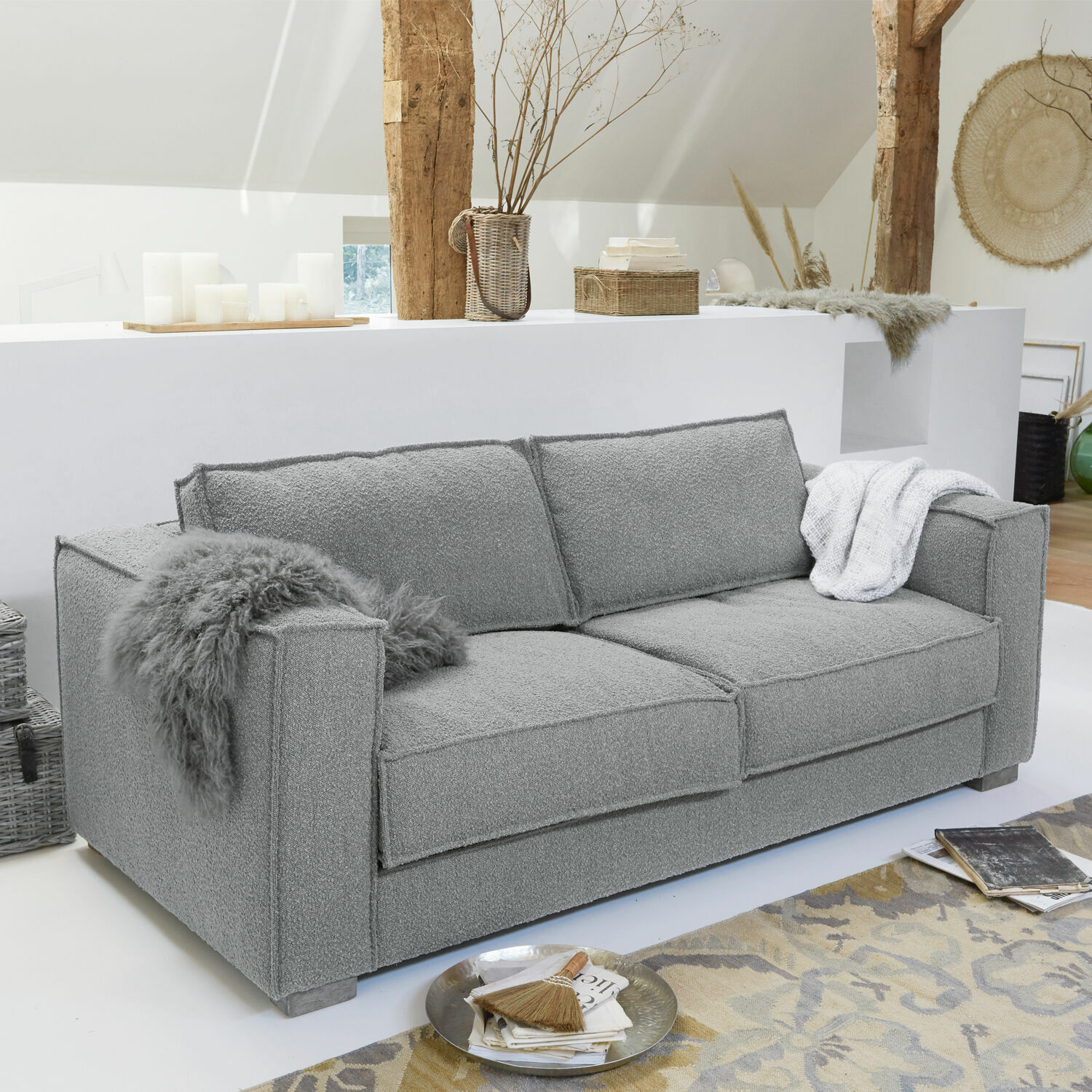 Lassen Sie sich fallen und Ihre Seele wird sofort baumeln: Ob Lektüre eines spannenden Romans im Schein der Leselampe, plaudern und lachen im Kreis von Freunde oder kuscheln mit der Familie – Sie werden viele schöne Momente mit diesem eleganten Sofa haben. Hier vereint sich Komfort mit zeitloser Eleganz: Das schicke Möbelstück bietet drei bis vier Personen eine bequeme Sitzmöglichkeit mit angenehm mittlerer Härte und besticht durch seinen wunderbaren Bloucle Stoff, der auch optisch stilvolle Akzente setzt. In Ihrem Wohn-, Arbeits- und Lesezimmer oder im Gesellschaftsraum kann das Sofa seine Wirkung perfekt entfalten. Das Gestell besteht aus Kiefernholz. So ist hohe Beständigkeit gesichert. Besonders schick: die Füße aus echtem Kautschukholz.