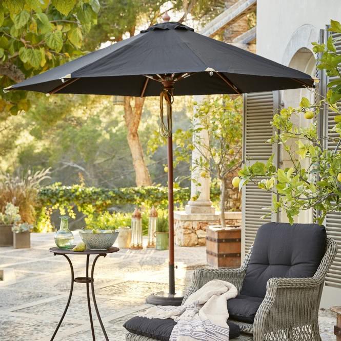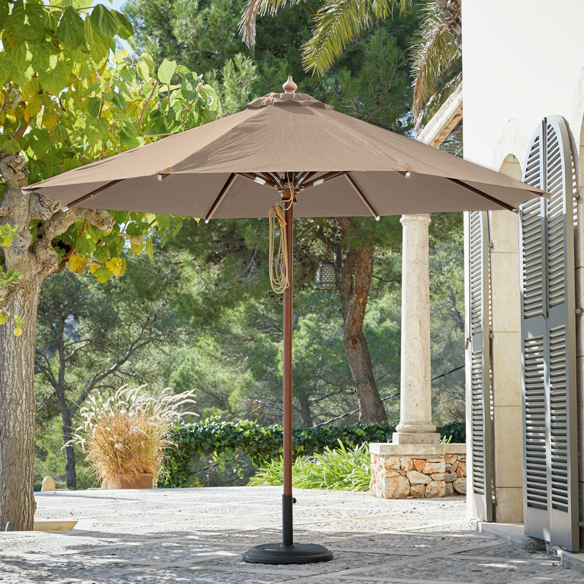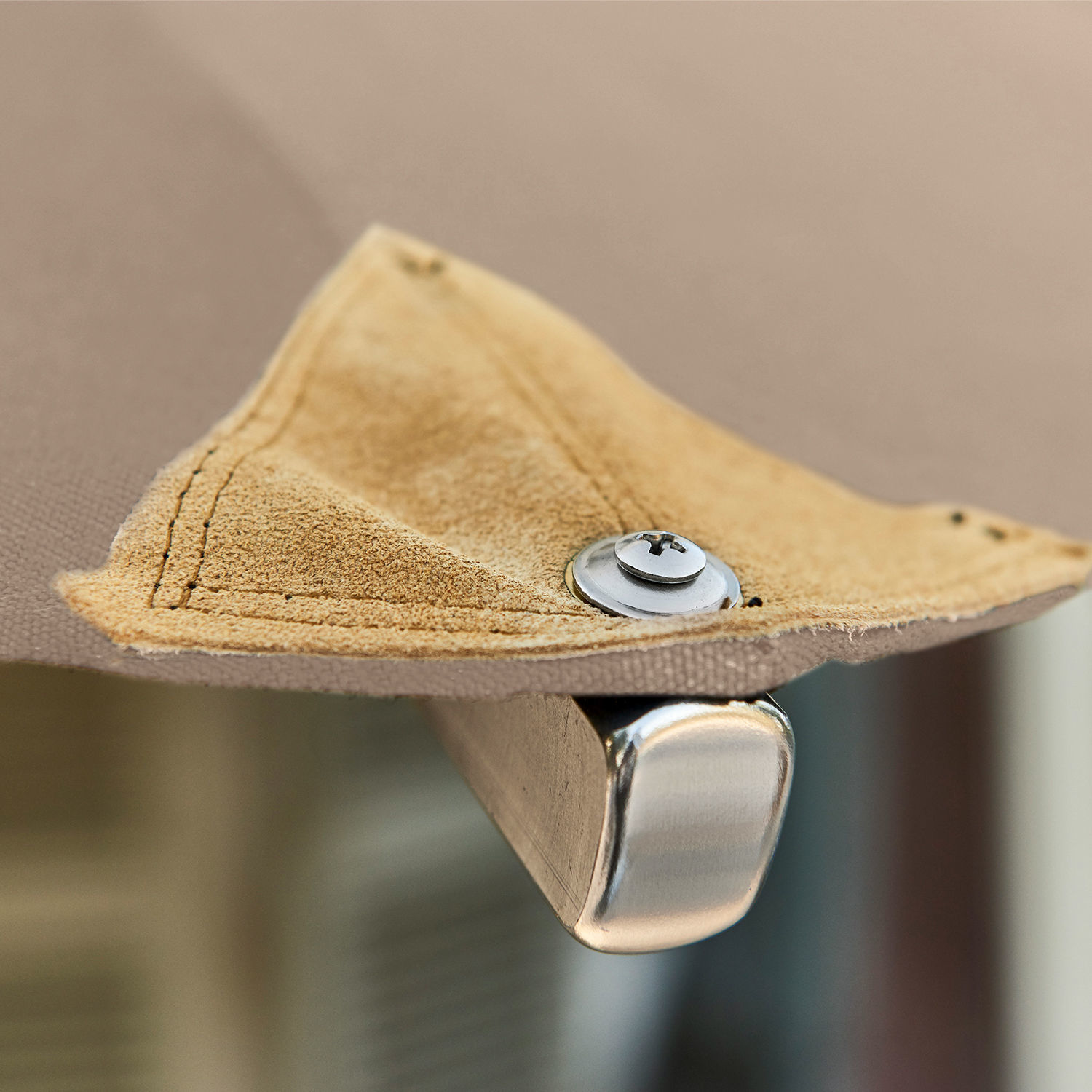 Edles Gestänge aus Eukalyptusholz. Bespannung aus robusten Olefinfasern. Doppelter Flaschenzug mit Ledermäppchen.