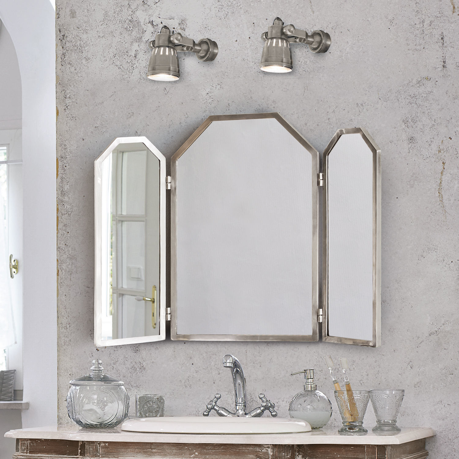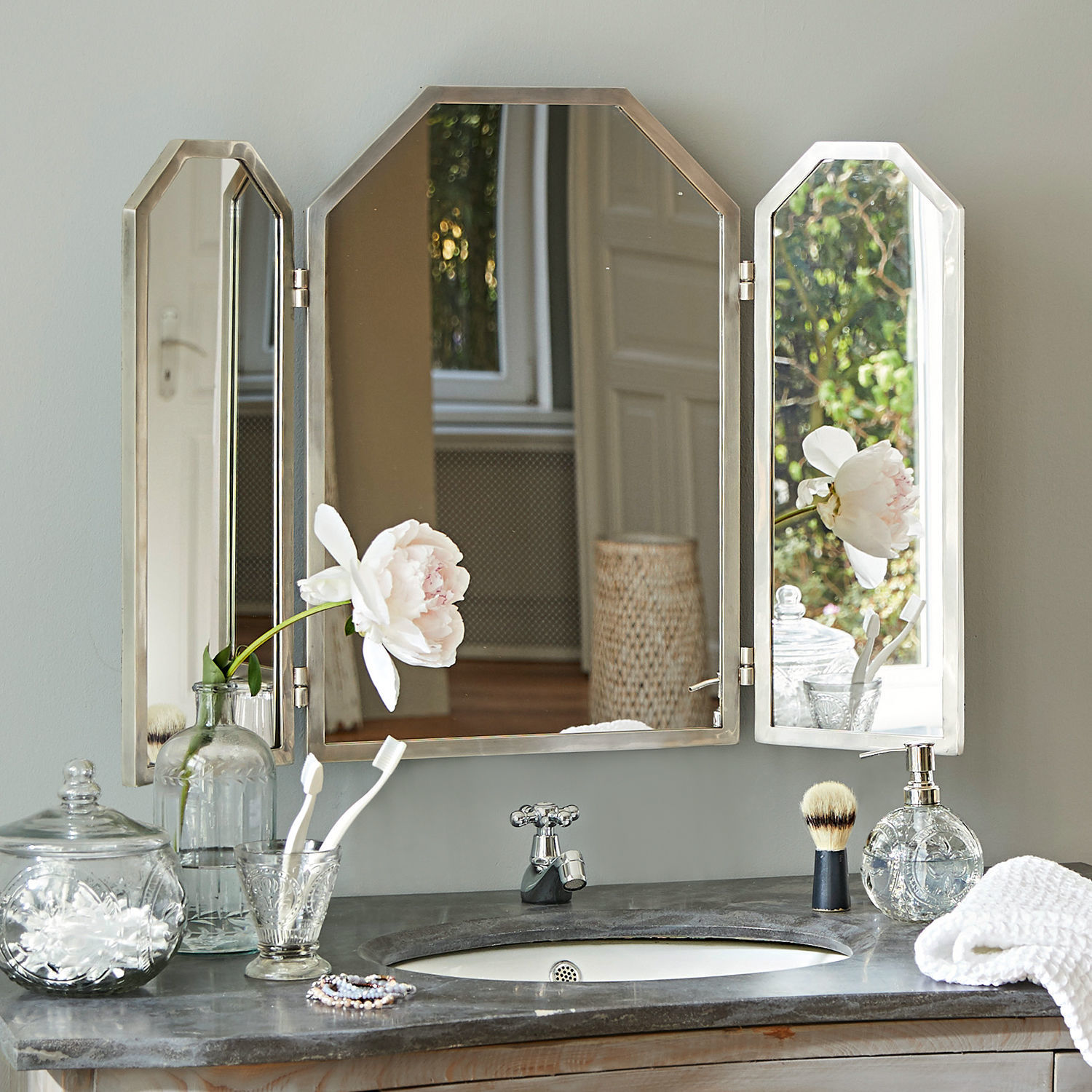 Elegante Formgebung mit klappbaren Seitenspiegeln. Mit wertigem Messingrahmen. Zum Aufstellen oder Aufhängen geeignet. Dieser formschöne Klappspiegel verbreitet […]