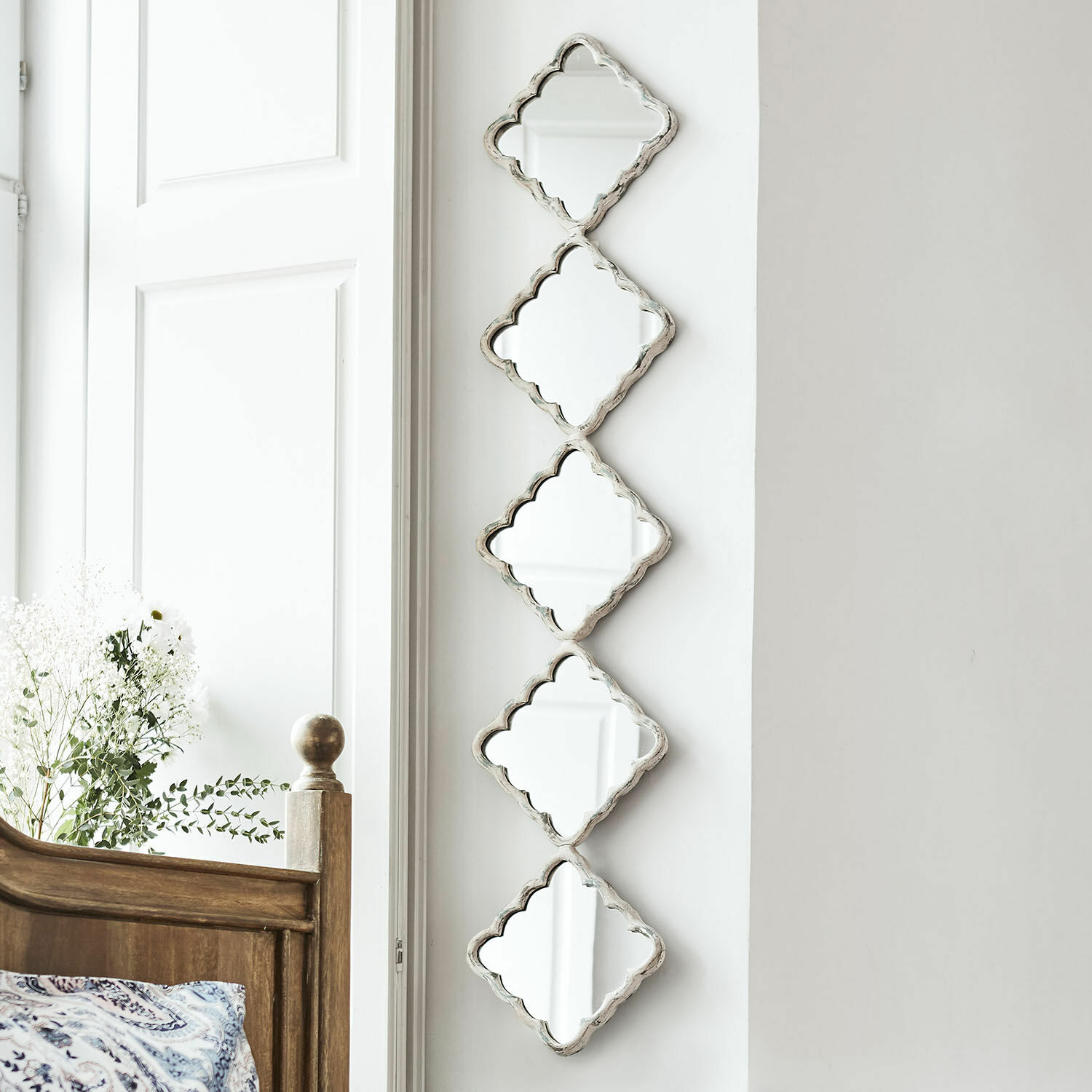 Nützlicher Spiegel und stilvolles Deko-Objekt in einem – die geometrische Formensprache und das Spiel der Materialien schenkt diesem Spiegel seine ganz besondere Aura. Insgesamt fünf rautenförmige Spiegelglas-Elemente fügen sich zu einem formvollendeten Ganzen zusammen, das von einem Gestell aus stabilen Eisen und MDF-Holz getragen wird. Jedes Element wird kunstvoll von einem schwungvoll gestalteten Rahmen aus Polyresin verziert. Das Antik-Finish prägt den gealterten Charakter, was das Schmuckstück noch schöner, edler und interessanter macht. Trotzdem behält das Accessoire seine schlichte, klarlinige Optik, so dass es an jeder Wand die Aufmerksamkeit auf sich zieht und sich in alle Interieurwelten harmonisch einfügt. So ist der Spiegel nicht nur in der Diele ein eindrucksvoller Darsteller, sondern auch beispielsweise im Schlafzimmer oder im Bad.