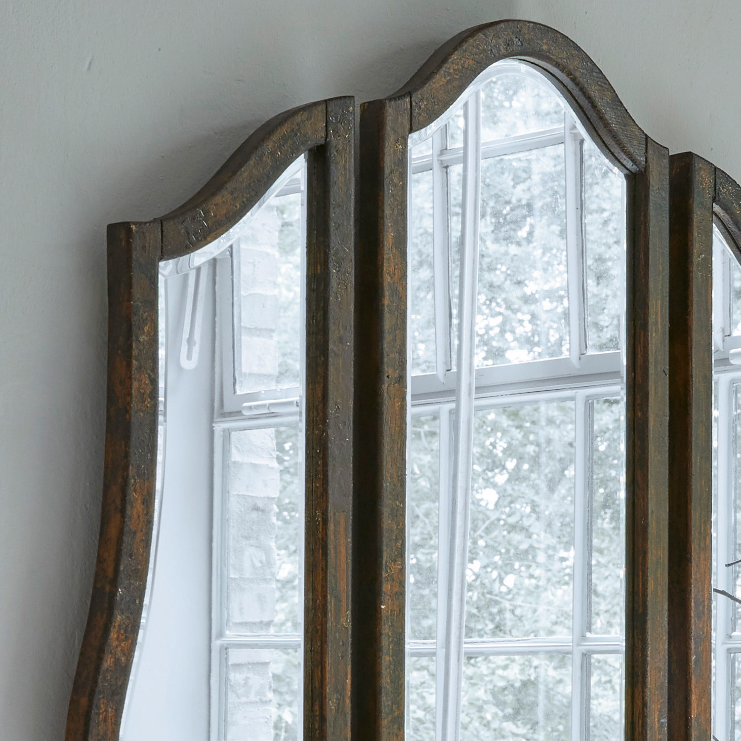 Ein wunderschönes und wertvolles Kunstwerk, mit dem Nostalgie pur einzieht. Der edle, große Spiegel besteht aus drei Teilen und überzeugt mit seiner wertigen Gestaltung und der charmanten, geschwungenen Formgebung. Die drei Teile lassen sich flexibel arrangieren, ob als Gesamtkunstwerk oder vielleicht auch einzeln platziert. Das elegante Modell besteht aus einem wunderschönen Rahmen aus Kiefernholz, der mit einem tollen Antik-Finish versehen ist. Hiermit haben Sie sich selbst im Blick und vergrößern zudem optisch jeden Raum – schön für ein Ankleidezimmer oder auch in Wohn- und Schlafräumen. Ein zeitloser Akzent mit Vintage-Charme, der auch im Flur Ihre Gäste begrüßt und beeindruckt.