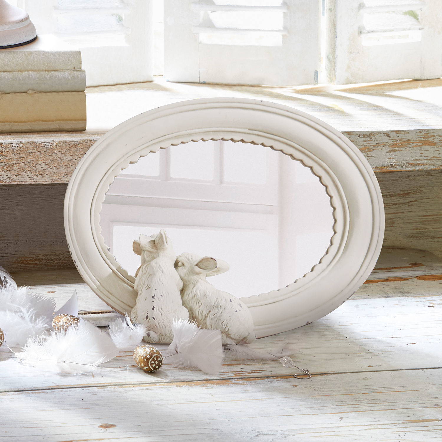 Freuen Sie sich auf ein wirklich entzückendes Design mit hohem Nostalgie-Faktor. Der wunderhübsche Rahmen des Spiegels aus Polyresin ist mit zuckersüßen Häschen verziert, die uns einfach zum Lächeln bringen. Der kleine Spiegel ist nützlich und zugleich eine wunderbare Zierde für jeden Raum. Er ist sehr romantisch und ideal für alle, die den Shabby-Chic lieben. Hiermit kommt ein reizendes und liebevoll designtes Accessoire zu Ihnen, das an ein liebgewonnenes Erbstück erinnert. Purer Vintage-Zauber für Ihr Heim.