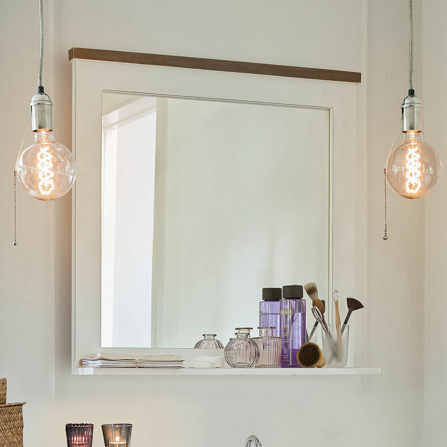 Imposant groß, in modern rechteckiger Form und schnörkellosem Design wird dieser Spiegel zusammen mit dem Waschtisch das Herzstück Ihres Badezimmers bilden. Denn selten werden Sie den Raum betreten, ohne schnell einen Kontrollblick in den Spiegel zu werfen. Und vielleicht zu Kamm und Haarbürste greifen, die griffbereit auf der Ablage unter der Spiegelfläche liegen. Die Spiegelfläche ist von einem breiten Rahmen umschlossen, oben setzt eine Abschlussleiste aus naturfarbenem Holz einen dekorativen Akzent zu dem strahlenden Weiß. Das massive, hochwertige Mangoholz, das für diesen Spiegel besonders sorgfältig verarbeitet wurde, ist sehr robust und gut auch für Räume mit einer zeitweise höheren Luftfeuchtigkeit geeignet. Mit seiner frischen, hellen Ausstrahlung ergänzt der Spiegel perfekt den Waschtisch (21016) und/oder den Waschbeckenunterschrank (21003), er ist aber nicht auf den Einsatzort Badezimmer beschränkt, sondern kann Ihnen auch im Schlafraum, im Ankleidezimmer oder im Flur von Nutzen sein. Zur sicheren Befestigung an der Wand ist der Spiegel auf der Rückseite mit integrierten Ösen ausgestattet.
