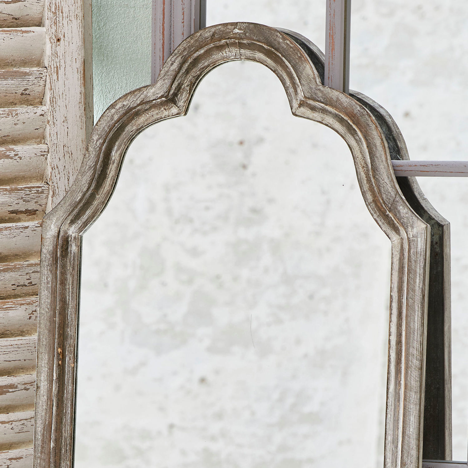 Wer schon einmal das Glück hatte, aus dem Fenster eines maurischen Palastes schauen zu dürfen, wird beim Anblick dieses Spiegels sicherlich daran erinnert worden sei. Denn der Rahmen des Spiegels ist der typisch orientalischen Fensterform nachempfunden, die sich erstaunlich gut auch in moderne Wohnmilieus einfügt. So ornamental der Rahmen gestaltet und so kunstfertig das massive Tannenholz profiliert ist, so zurückhaltend ist jedoch seine Farbgebung, wie es typisch für Objekte aus früheren Epochen ist. Hier verleiht ein White-Washed-Finish dem Holz den authentischen Antik-Look, als sei der Spiegel tatsächlich schon sehr alt und auf wundersamen Wegen aus dem Morgenland zu uns in die Gegenwart gereist. Der Spiegel setzt einen spannenden Akzent im modernen Landhaus-Stil, er fügt sich ebenso gut ins klassisch-elegante Milieu und bildet im modern puristischen Ambiente den stylischen Hingucker. Und diese Wirkung entfaltet der Spiegel im Wohnraum, im Schlafzimmer, im Flur oder auch im Bad – ganz, wie es Ihnen am besten gefällt. Sie sind auf den Geschmack gekommen? Dann lassen Sie auch liebevoll verzierte Dosen und Gläser, üppig geschmückte Kissen aus Samt und Seide bei sich einziehen und erleben Sie, wie Ihr Zuhause eine ganz unverwechselbare Ausstrahlung bekommt.