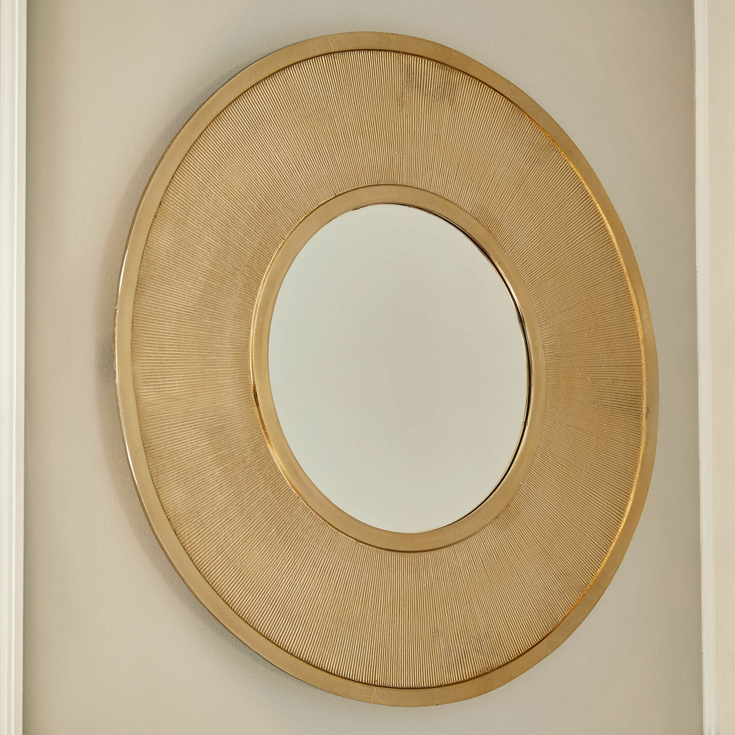 Dekorativ, elegant, außergewöhnlich wie ein Kunstwerk – dieser aufwendig gestaltete Spiegel glänzt mit mehreren Prädikaten gleichzeitig. So faszinierend ist sein Auftritt, dessen markanter, runder Rahmen aus Aluminiumguss gefertigt ist. Die typische Struktur entsteht durch das besondere Gussverfahren. Dazu kommt das fein strukturierte Rillenmuster, goldfarben veredelt erinnert es an unzählige Sonnenstrahlen, die jeden Raum mit Licht und Wärme erfüllen. Durch eine Aufhängeleiste mit zwei Haken lässt sich das Wohnaccessoire problemlos und sicher an der Wand befestigen. So viel Stil und Glamour zieht alle Blicke auf sich – im Wohnzimmer, Schlafzimmer oder Diele. Mit klassischen oder außergewöhnlicheren Einrichtungen harmoniert das exquisite Schmuckstück gleichermaßen schön.