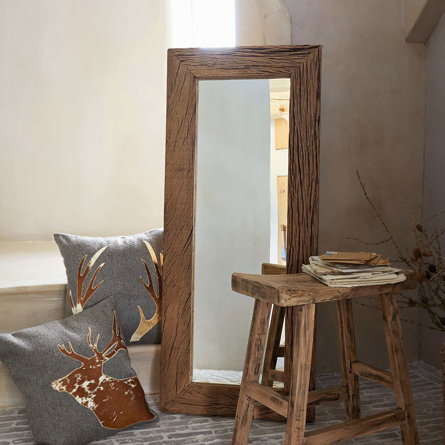 Wer einmal bei einem Strandspaziergang ein vom Meer angeschwemmtes Stück Treibholz entdeckt hat, weiß, welche Faszination von solchen Hölzern ausgeht. Da ist es kein Wunder, dass auch ambitionierte Möbel-Designer die besondere Ausstrahlung dieser Hölzer spüren und von ihnen zu außergewöhnlichen Kreationen inspiriert werden. Zum Beispiel zu einem Spiegel wie diesem hier. Der Rahmen ist komplett aus naturbelassenem Treibholz gefertigt, und zwar aus dem Holz eines Salbaums. Dieser ist ein imposantes, exotisches Gewächs, dessen extrem hartes Holz ein wenig an Teak erinnert. Eine Besonderheit, die das Salbaumholz gerade für Künstler so interessant macht: Die Oberfläche zeigt bereits von Natur aus eine rustikale Struktur mit unverwechselbaren Besonderheiten, die durch das ausdrucksstarke Finish, das die Zeit und das Meer dem Holz verliehen haben, noch betont wird. Das Holz für diesen Spiegelrahmen wurde natürlich in einem aufwändigen Prozess wiederaufbereitet, doch die individuellen Merkmale blieben glücklicherweise erhalten und machen jeden Spiegel zu einem Unikat. Dieses extravagante Accessoire passt hervorragend in den Eingangsbereich des Hauses, es macht sich aber auch in einem Schlafzimmer im rustikalen Landhaus-Look oder auch über einem ausgefallenen Waschtisch im Bad ausgezeichnet. Weil der Spiegel jeweils an einer kurzen und einer langen Seite mit zwei Haken ausgestattet ist, können Sie wählen, ob Sie ihn je nach Raumsituation hochkant oder quer aufhängen.