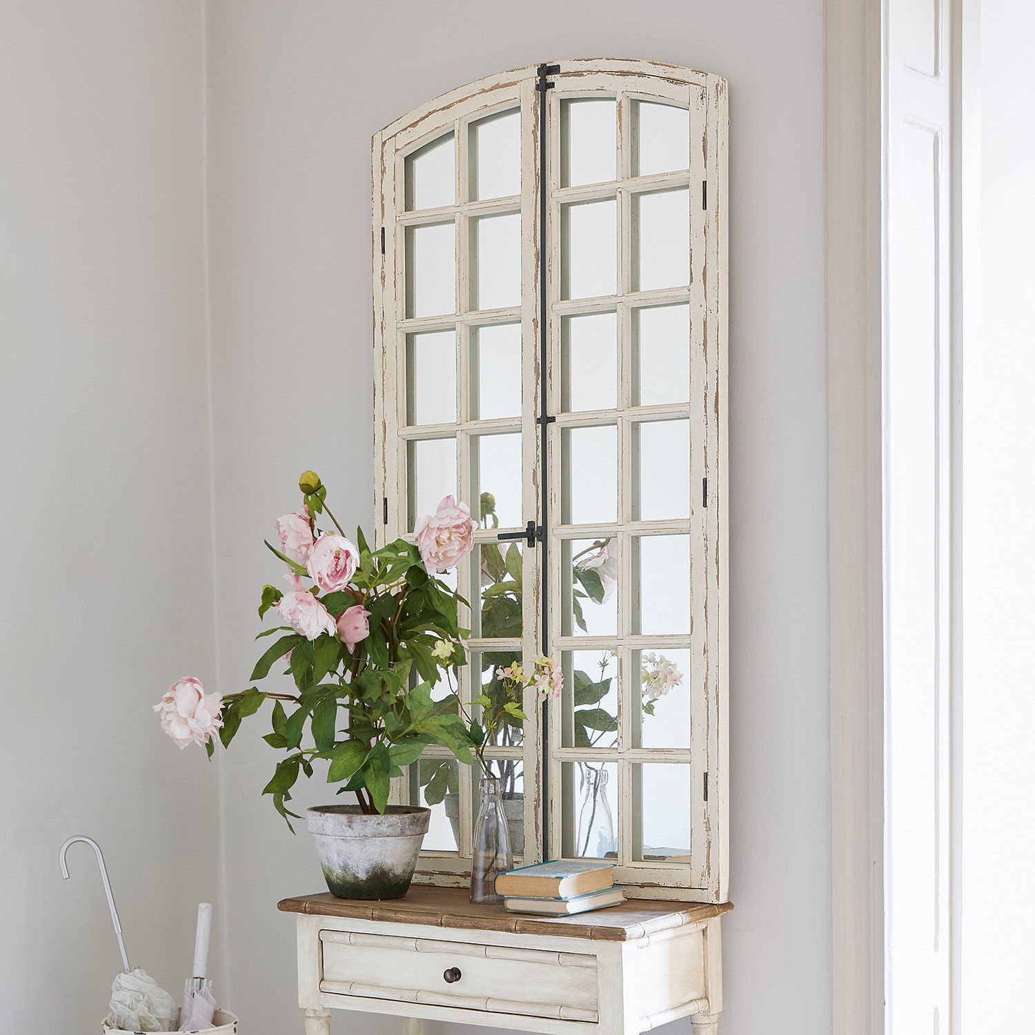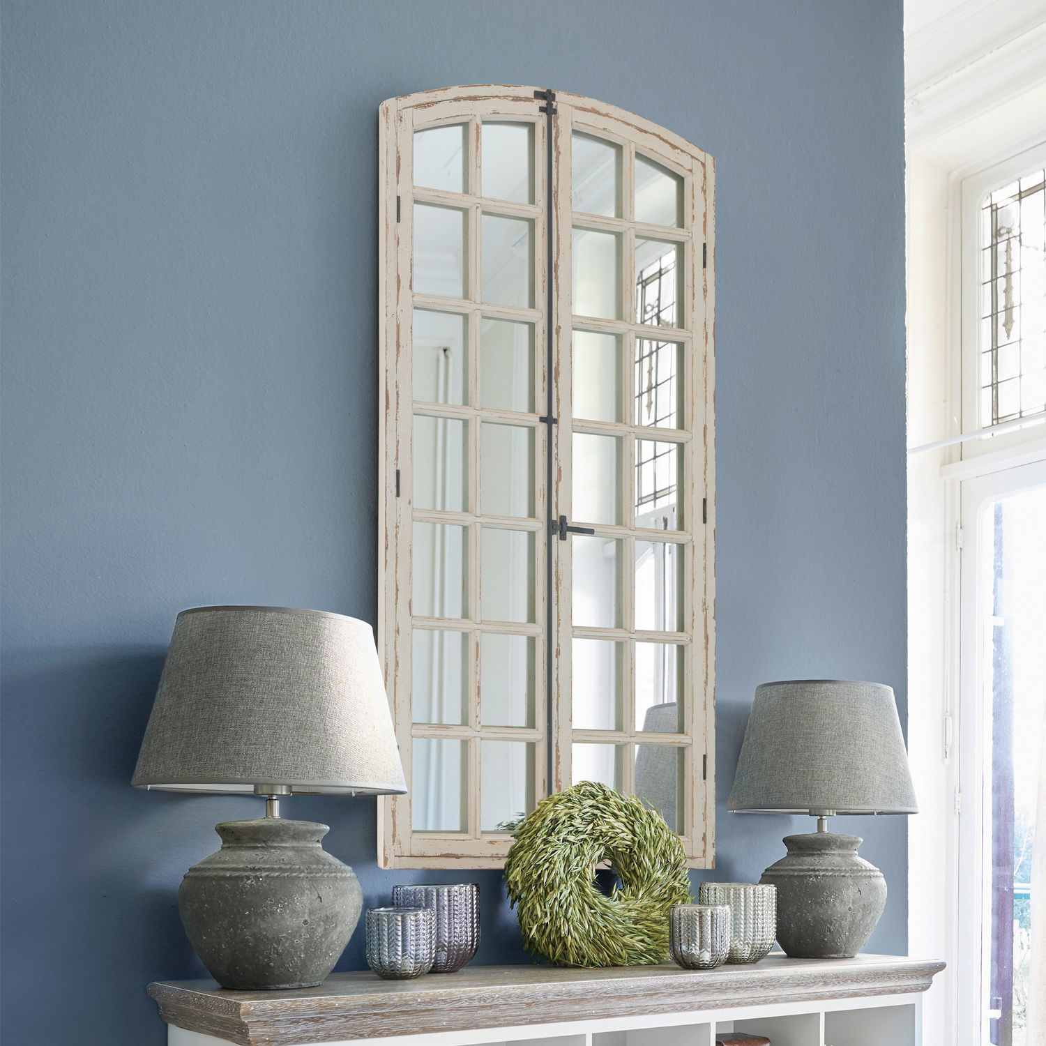 Es gibt nichts Schöneres, als von einem neuen, kreativen Design überrascht zu werden. Genau deshalb werden Sie diesen Spiegel lieben, denn er hat nicht nur die Form eines Fensters, sondern er ist auch mit zwei klappbaren Fensterflügeln ausgestattet. Sie können die Flügel ganz nach Belieben und aus- und einklappen. Auch für kleine Deko-Ideen können die Fensterrahmen dienen. So können Sie den Spielg zusätzlich hübsch schmücken. Das dezente Shabby-Finish des Holzrahmens vollendet einen romantischen Vintage-Look. Durch seine imposante Größe ist dieser Spiegel nicht nur für den Eingangsbereich oder das Ankleidezimmer ideal. Seine große Fläche verleiht jedem Raum ein Gefühl von Tiefe und Weite.