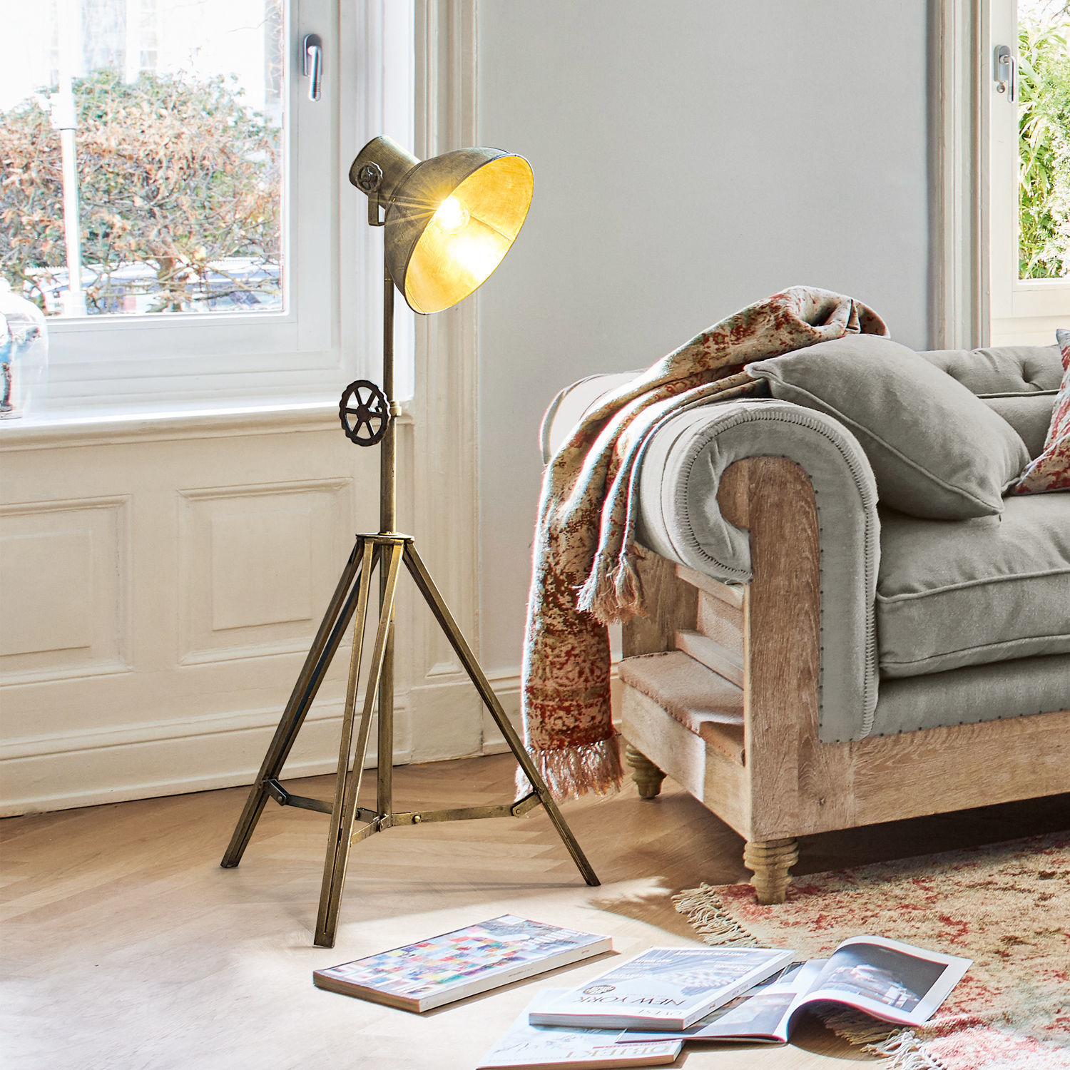 Zeitlosen Industrie-Chic verkörpert diese einzigartige Stehlampe, die mit einem eleganten Design und intelligenten Funktionen punktet. Die Höhe lässt sich über die auffällig schöne Handschraube verändern, doch auch der Dreifuß-Ständer bietet Verstellmöglichkeiten. So können Sie den eleganten Lichtspender zentimetergenau den eigenen Vorlieben anpassen. Die Stehlampe ist komplett aus hochwertigem Eisen gefertigt und erfreut das Auge des Betrachters mit einer Oberfläche, die matt schimmert. Je nach Leuchtmittel kann der Glanz auch individuell verändert werden. Der große Schirm ermöglicht eine angenehm gleichmäßige Beleuchtung des gesamten Raumes.