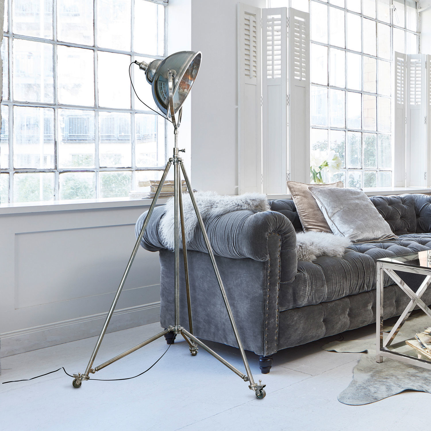 Spot an, Kamera läuft! Hier rückt eine Stehlampe ins Rampenlicht, die sonst eher im Hintergrund aktiv ist und ihren Lichtstrahl auf Gegenstände und Personen wirft, damit diese perfekt fotografiert oder gefilmt werden können. Zumindest erweckt diese Stehlampe sehr überzeugend den Eindruck, als hätte sie sich früher dieser Aufgabe gewidmet, würde jetzt aber gerne ihre Fähigkeiten in private Dienste stellen. Zum Beispiel Ihre Lektüre perfekt ausleuchten, während sie zugleich eine gemütliche, indirekte Lichtstimmung im Wohnraum schafft. Dafür ist die Lampe mit allem ausgestattet, was notwendig ist. Das beginnt bei dem großen Schirm, der an die Studiobeleuchtung früherer Zeiten erinnert. dafür sorgt aber auch der dreibeinige Stativfuß, der damals wie heute der Lampe die ausgezeichnete Stabilität garantiert. Wie für professionelle Beleuchtungen üblich sind Schirm und Stativ beweglich: Der Lampenschirm kann nach vorne und hinten bewegt werden, der Fuß ist höhenverstellbar. Selbst an die Mobilität wurde gedacht, denn die Stehlampe ist mit Rollen ausgestattet, deren Bremse Sie leicht lösen können, so dass die Lampe bei Bedarf den Standort wechseln kann. Eine besondere Studioleuchte, die aus hochwertigem Messing gefertigt und zusätzlich mit einem Antik-Finish versehen wurde, das mit der Zeit stilvoll altern und den historischen Charakter betonen wird.