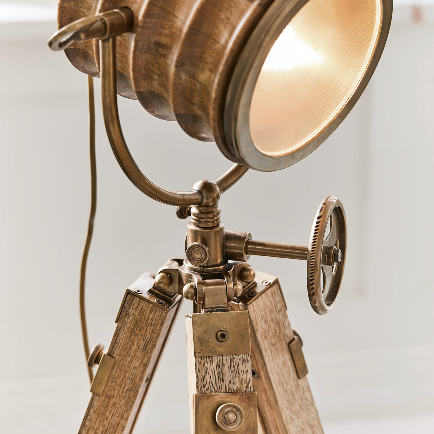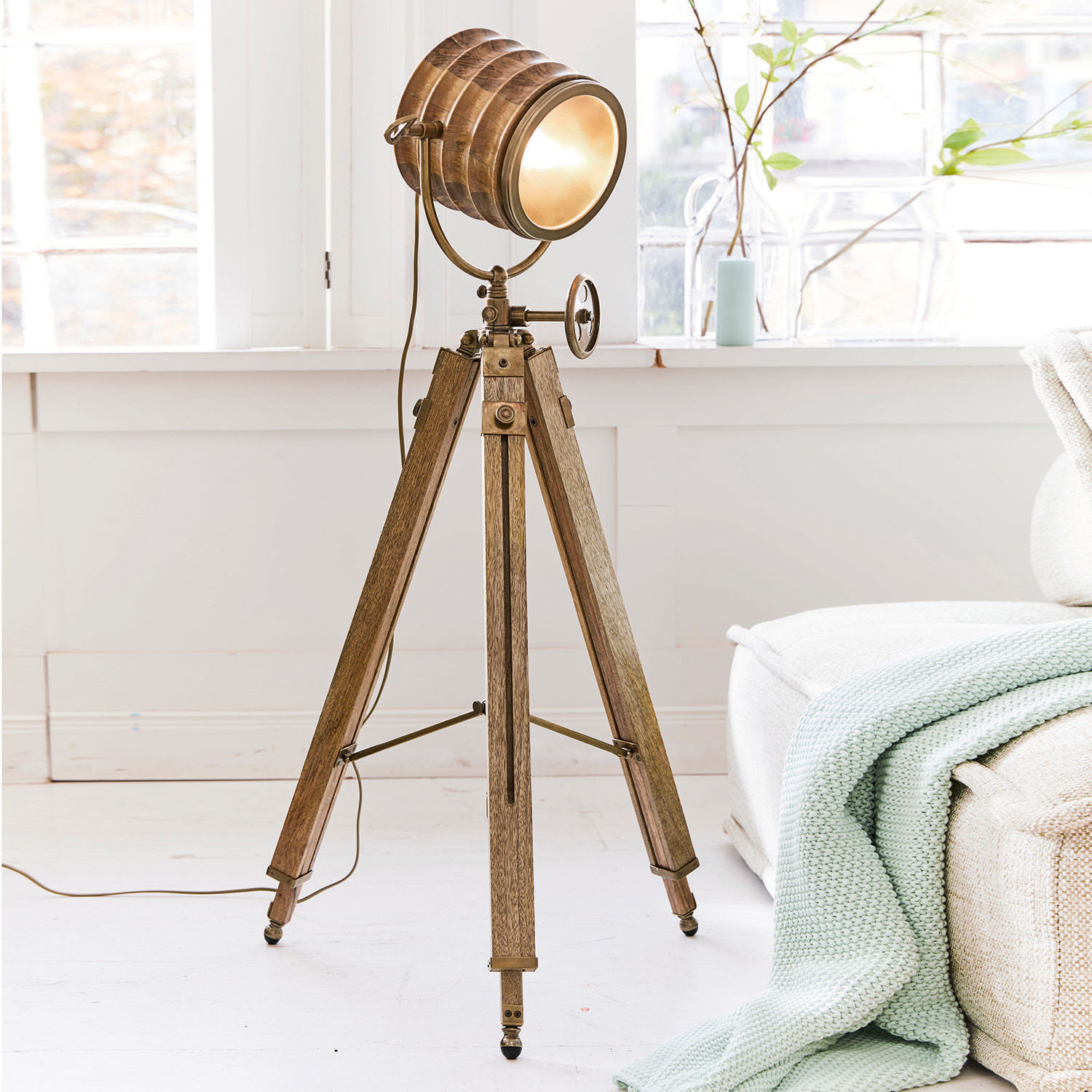 Lampen sind zu den Trendsettern der Einrichtung aufgestiegen. Sie bieten nicht nur eine ideale Lichtquelle für diverse Plätze, sondern werden auch als stilgerechte Deko-Objekte immer beliebter. Das gilt auch für diese extravagante Stehlampe, dessen ausziehbarer Dreifuß an ein funktionales Stativ erinnert. Dass sich die Beine in der Höhe variieren lassen ist selbstverständlich. Gefertigt aus robustem Mangoholz ist das Gestell absolut standfest, abgerundet durch coole Messingelemente mit Antik-Finish, die gekonnt den Look des runden Lampenkopfes aufnehmen. Dieser ist schwenkbar und durch ein großes Drehrad höhenverstellbar – das macht die Stehlampe nicht nur zum perfekten Begleiter jedes Sofas, auch einzelne Objekte lassen sich damit ganz individuell ins schönste Licht rücken. Praktisch: Für das Einsetzen eines Leuchtmittels müssen Sie einfach nur das Frontglas abdrehen. Ein außergewöhnlicher Blickfang für moderne Wohnkonzepte wie den Industrial-Stil, aber auch in einem Interieur wie den Landhaus-Look oder Shabby-Chic integriert sich diese Lampe hervorragend.