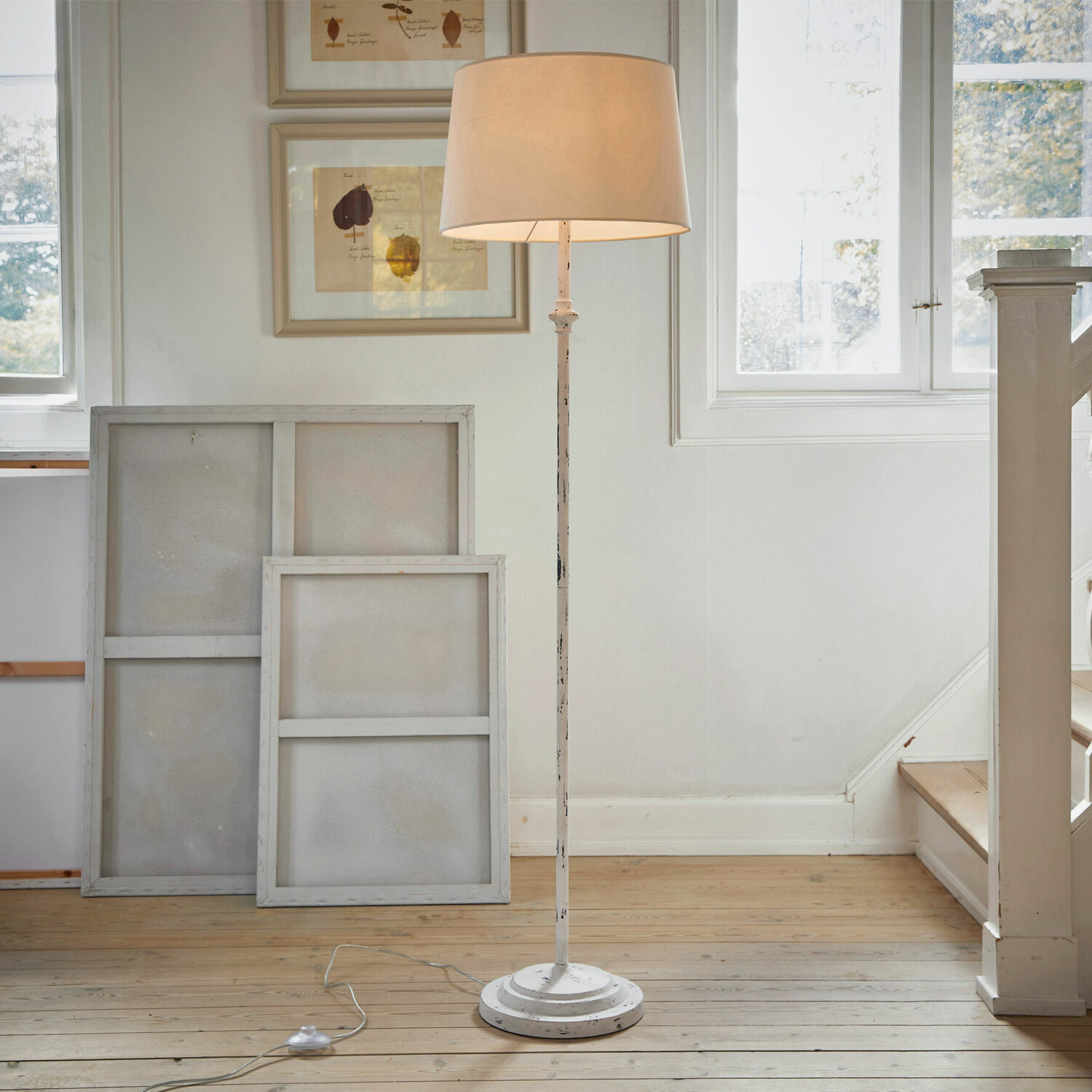 Eine Stehlampe ist die einfachste und effektivste Möglichkeit, um den Look eines Raumes aufzufrischen. Schließlich ist eine hübsche Designerlampe kein bloßer Lichtspender, sondern auch ein dekoratives Accessoire. Bei diesem besonderen Modell wurde der kunstvoll geformte Eisensockel mit einem intensiven Antik-Finish veredelt, das für einen zeitlosen Shabby-Look sorgt. Die schlanke Form mit ihren künstlerischen Feinheiten wirkt äußerst stilvoll und auch unaufdringlich, damit sich die Stehleuchte nahtlos in jedes Interieur einfügen lässt. Der hochwertige Baumwollschirm rundet diese schöne Stehlampe perfekt ab und verleiht neutralen Farbschemata die gebührende Aufmerksamkeit. Natürlich ist die Unterseite der runden Basis mit einem Filzgleiter bestückt, um den Boden Ihres Zuhauses zu schützen. Die Lampe wird ohne Leuchtmittel geliefert, um Ihnen bei der Wahl der Beleuchtung freie Hand zu lassen.
