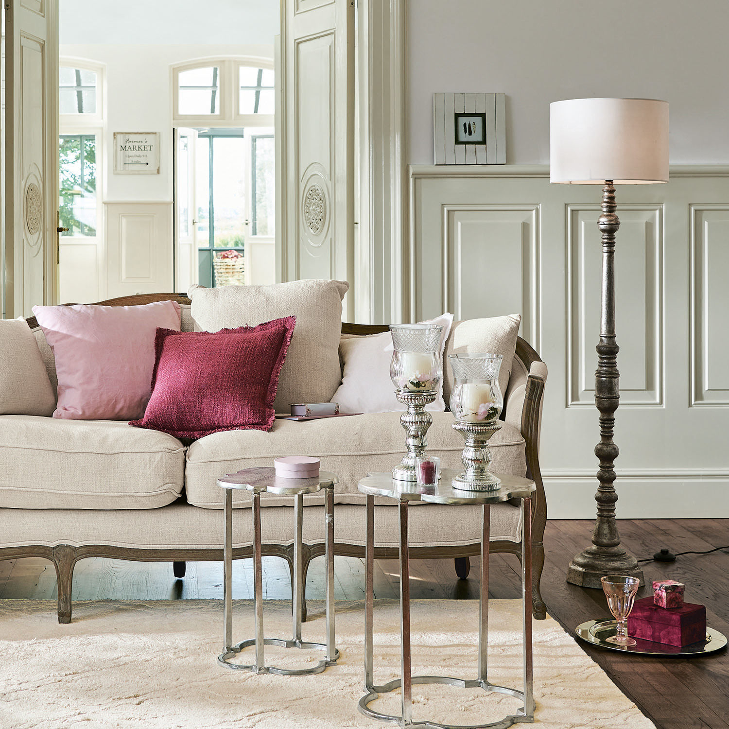 Diese bezaubernde Stehlampe könnte direkt aus dem Salon einer alten Villa in einem Pariser Vorort stammen. Das charakteristische Design verleiht Ihrem Zuhause einen Hauch französischer Eleganz. Eine echte Besonderheit ist der kunstvoll gedrechselte Fuß aus hochwertigem Mangoholz. Er ist ein Paradebeispiel für gehobene Handwerkskunst und erhält durch seine raffinierte Oberflächenbehandlung einen edlen Metallic-Look. Der sanfte Schimmer unterstreicht die feinen Rundungen und Abstufungen, während die schlanke Formsprache auch funktionellen Charakter hat. Selbstverständlich ist der Schirm perfekt auf den Fuß abgestimmt. Der reine Baumwollschirm bildet in Sachen Farbe und Textur einen charmanten Kontrast zum metallisch wirkenden Finish. Die breite Trommelform harmoniert wiederum perfekt mit der schlanken Gestalt des Fußes.