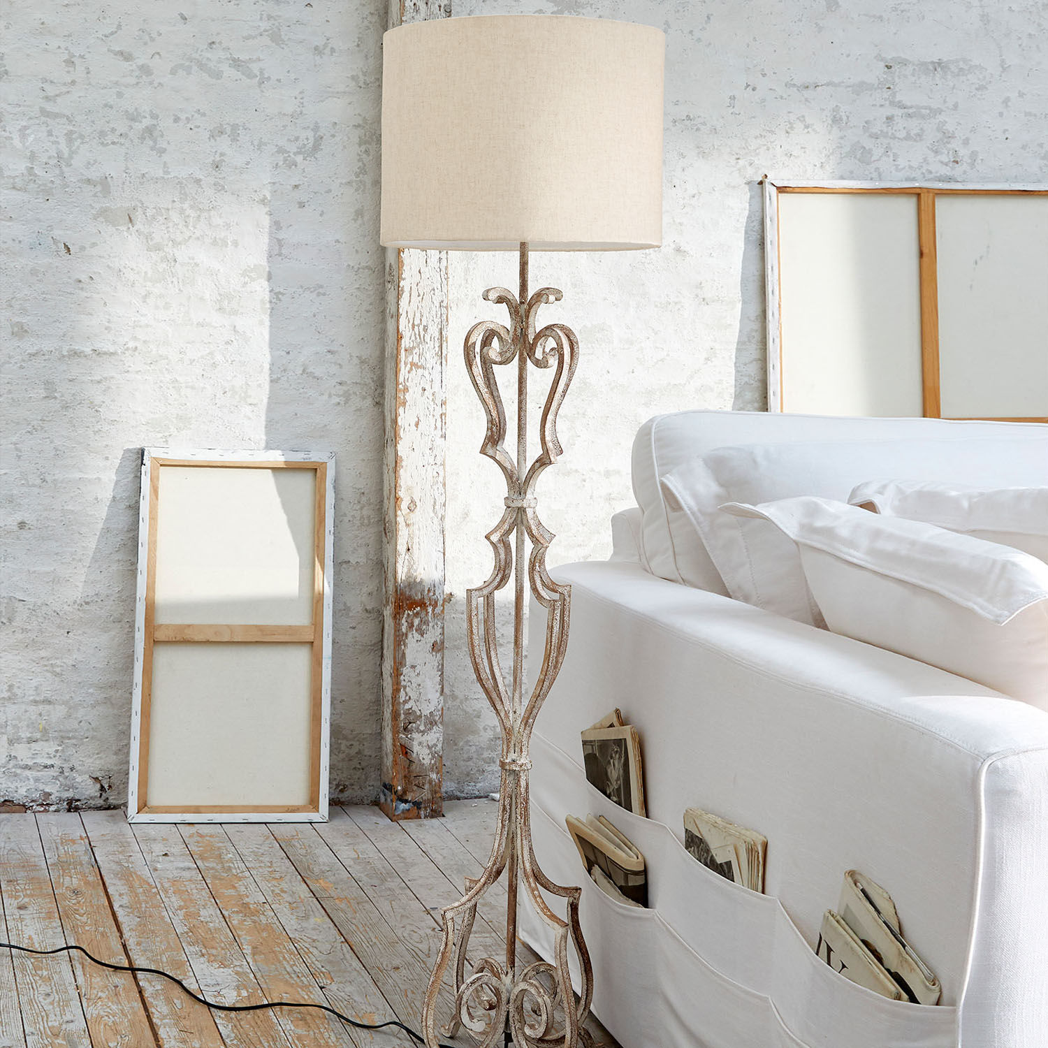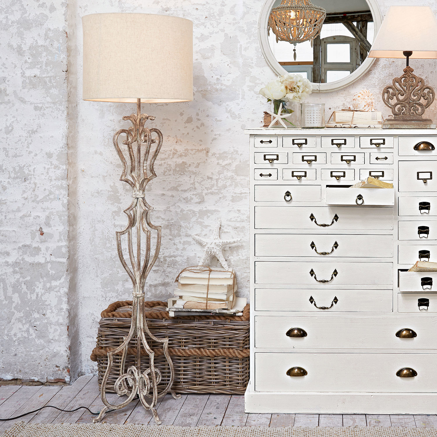 Ein wertvolles Kunstwerk mit purem Vintage-Charme – freuen Sie sich auf ein echtes Highlight im luxuriösen, französischen Landhaus-Stil. Die hochwertige, hohe Stehlampe bezaubert mit einem sehr kunstvoll gestalteten Fuß aus Eisen. Ihn ziert ein kräftiges Antik-Finish, wodurch eine authentische Patina entsteht. Der Schirm ist dazu passend aus schönem, reinen Leinen. Das perfekte Accessoire für alle, die den Shabby-Chic und die Designs aus der guten alten Zeit lieben. Bei diesem schönen Anblick können Sie gedanklich immer wieder in die Vergangenheit reisen und einen sehr gekonnten Akzent zum Landhaus-Stil setzen. An diesem stilsicheren Modell werden Sie viele Jahre Freude haben. Genießen Sie den dekorativen Effekt sowie eine gemütliche Beleuchtung – wunderbar für das Wohnzimmer oder auch Ihre Schlafräume.