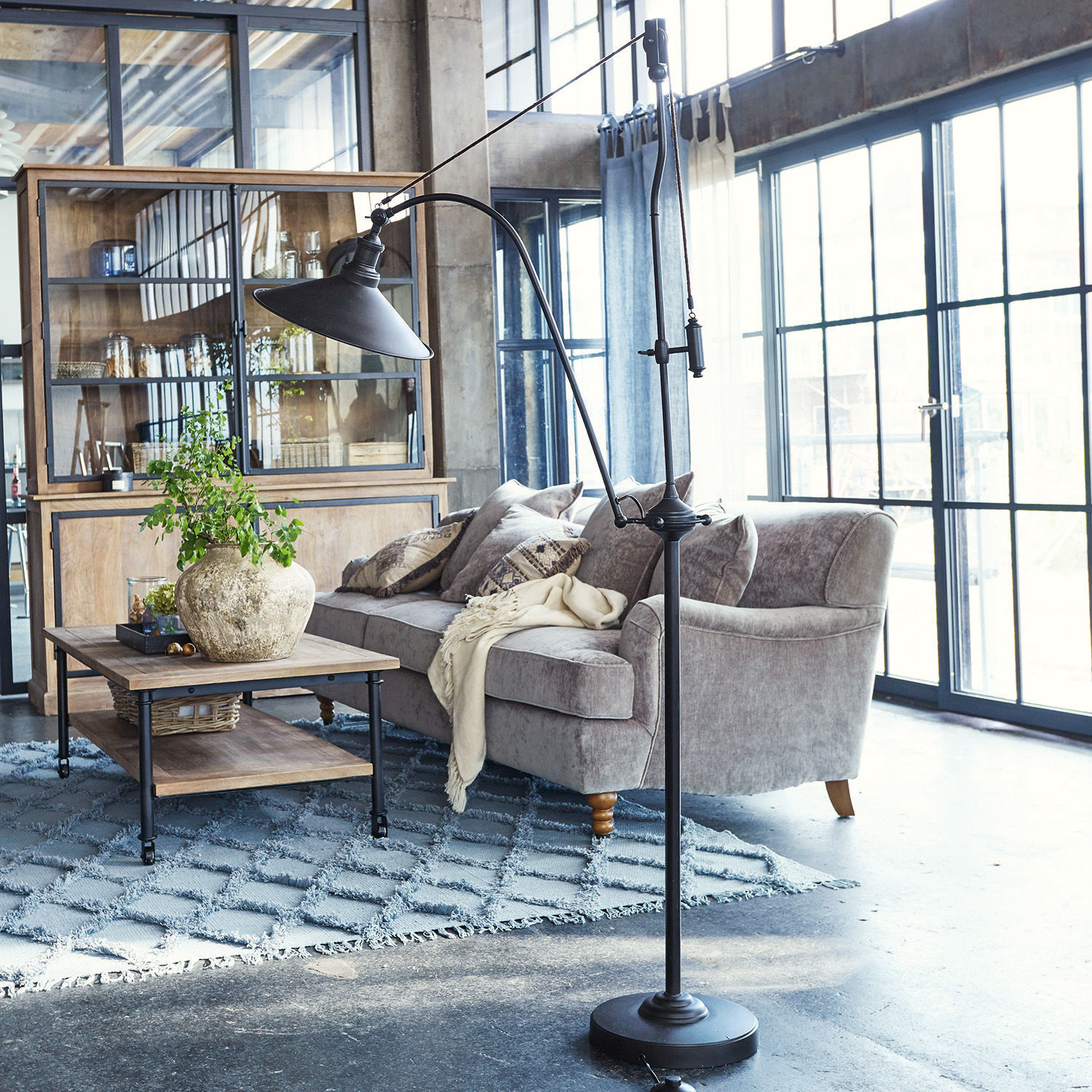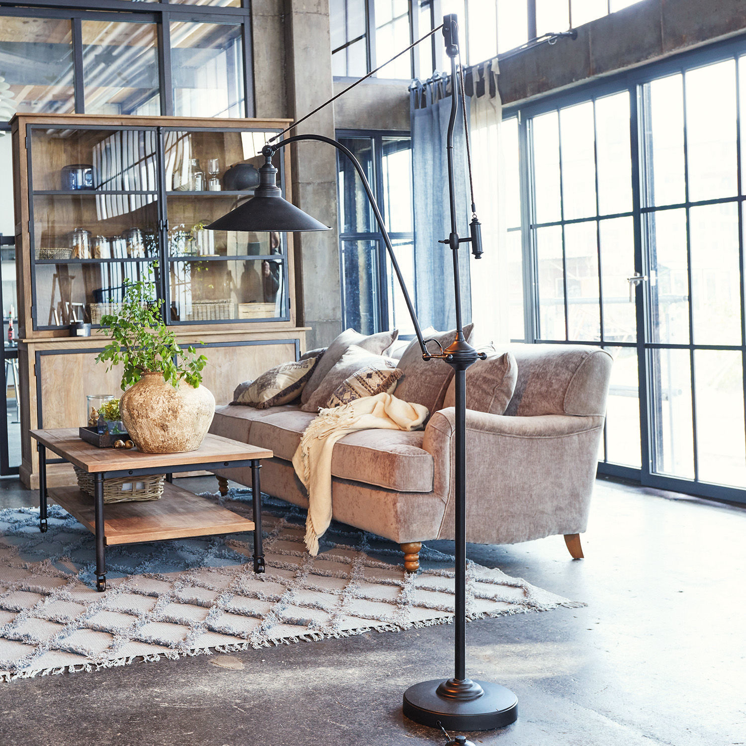 Interieur-Spezialisten wissen: Erst das richtige Licht macht die Stimmung im Raum perfekt. Und diese Stehlampe ist eine echte Spezialistin, wenn es darum geht, Licht gezielt von oben auf einen Couchtisch, auf das Sofa oder auf ein Buch zu richten, das wir in der Hand halten, während wir in unserem Lieblingssessel sitzen. Warum sie ihrer Aufgabe so perfekt nachkommen kann? Weil sie eine raffinierte Kombi aus einer klassischen Stehlampe mit einer Bogenlampe ist. Sie hat ein schlankes Gestell auf einem stabilen Fuß, sie hat aber auch einen elegant geschwungenen Arm, an dem der Lampenschirm hängt. Das Geniale an dieser Konstruktion ist der integrierte Seilzug mit einem Metallelement als Gegengewicht, mit dem die Höhe des Lampenschirms und damit die Lichtquelle den individuellen Anforderungen angepasst und in der gewünschten Höhe fixiert werden kann. Je nachdem, wie sich das jeweilige Abendprogramm bei Ihnen gestaltet, verbreitet die Stehlampe ihr Licht mal höher, mal tiefer. mal direkter, mal indirekter. Und das gelingt ihr auf eine so charmante Art und Weise, dass es kaum ein Interieur gibt, in das sie sich nicht perfekt einfügt. Sie besteht hauptsächlich aus stabilem Eisen – einem Material, wie es uns vielfach im Industrial-Style begegnet. Mit dezenten Zierelementen geschmückt, fühlt sich die Stehlampe auch im gepflegten Landhaus-Ambiente zu Hause.