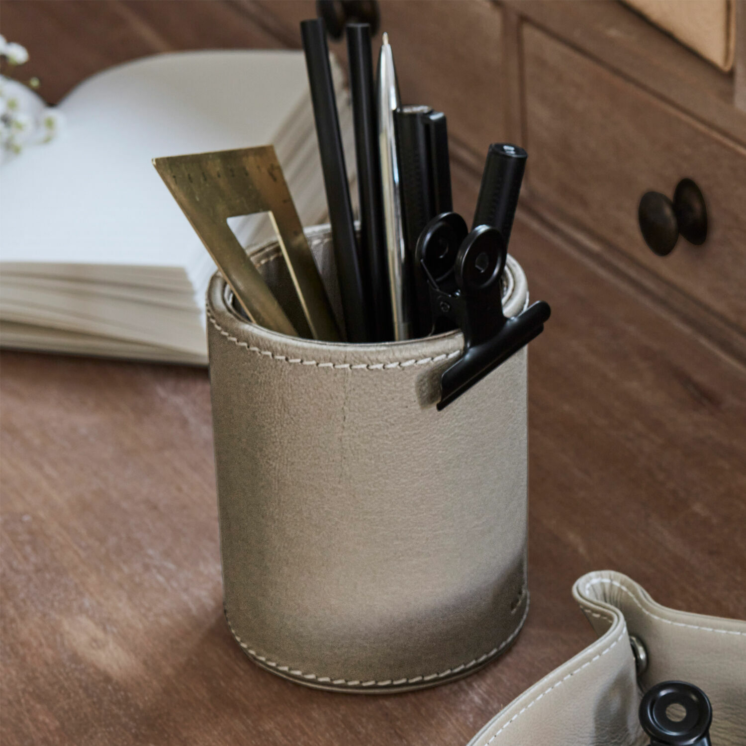 Greifen Sie zu: Der edle Stiftebecher bietet nicht nur den Komfort, Füller, Kugelschreiber, Bleistift, Lineal, Schere und Co. griffbereit zu halten. Auf Ihrem Schreibtisch ist er auch ein echter Eyecatcher. Außen ziert ihn hochwertiges Ziegenveloursleder, das nicht nur durch seine außergewöhnliche Optik besticht, sondern auch durch seine wunderbare weiche Haptik. Exklusive Akzente setzen die weiße Ziernaht und das kunstvolle Loberon-Branding, das unaufdringlich für dezente Reize sorgt. Das Leder lässt sich mit einem weichen, trockenen Lappen leicht reinigen. Ein absolut schickes Schmuckstück und zugleich äußerst praktisch – so entsteht echte Wohlfühl-Arbeitsatmosphäre. Einen besseren Begleiter für produktive Stunden kann man sich kaum wünschen. Greifen Sie zu!