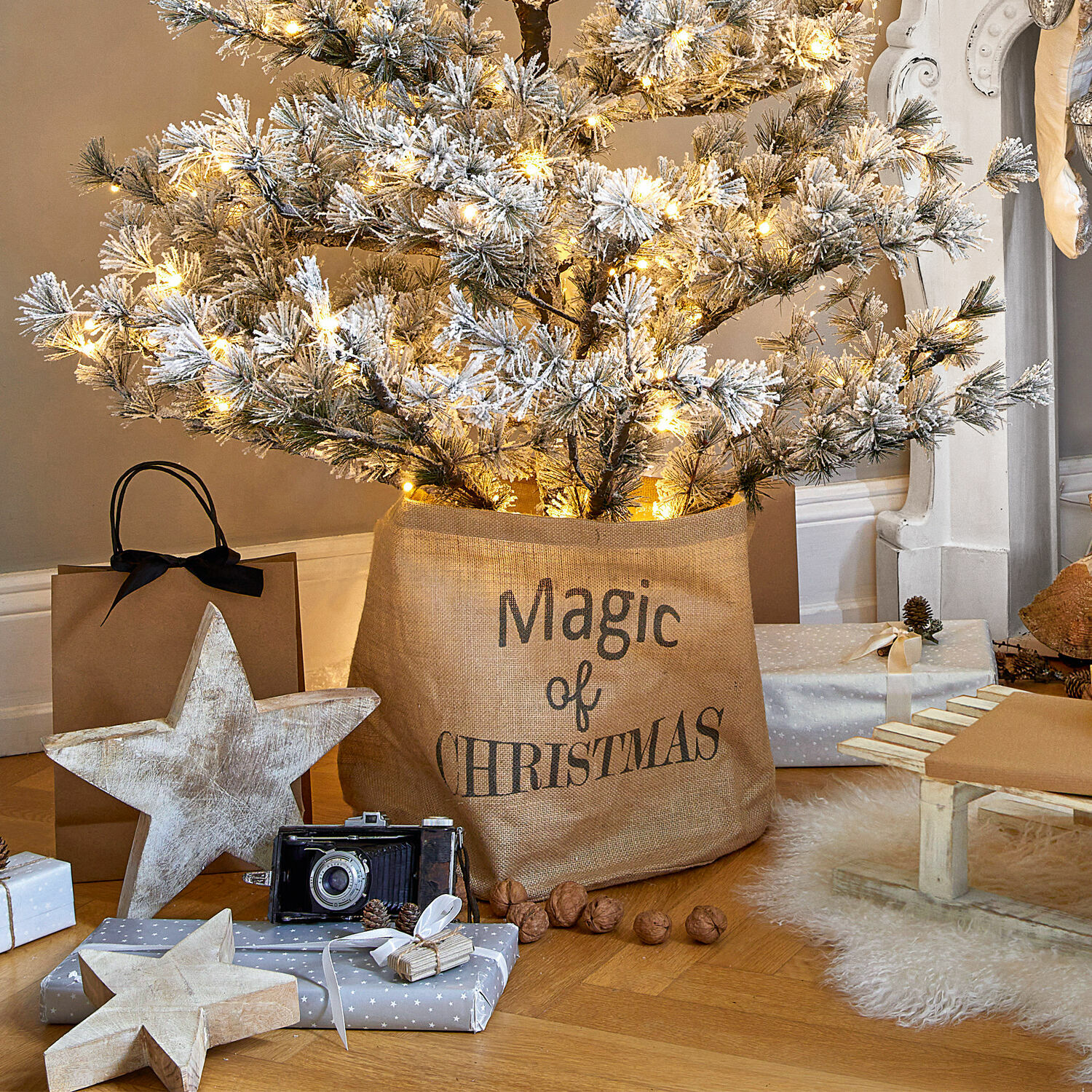 Vorbei sind die Zeiten als Körbe ausschließlich praktischen Zwecken dienten wie beispielsweise zum Aufbewahren und Transportieren ausrangierter Utensilien. Jetzt haben sie als dekorative Wohnakzente ein neues Image bekommen und begeistern in vielen Designs und Materialien. Dazu gehört auch dieser stilvolle Stoffkorb aus grob strukturiertem Jutegewebe. Das weiche Naturmaterial verleiht eine wunderbar natürliche Anmutung, ist äußerst robust im Gebrauch und kann ganz nach Wunsch effektvoll drapiert werden. Der auffällige Letterprint Magic of Christmas wird zum Blickfang und bekundet die Vorfreude auf das schönste Fest des Jahres. Durch die Innenbeschichtung wird der Stoffkorb nicht nur wasserresistent und formstabiler, sondern kann auch ganz einfach gesäubert werden. Was liegt also näher, als diesen Korb für stimmungsvolle Weihnachtsideen mit viel frischem Grün in Szene zu setzen – mal mit Tannenzweigen bestückt für den Eingangsbereich, mal als schmückendes »Beinkleid« für den Tannenbaum. Nach den Festtagen lässt sich die Beuteltasche klein zusammenfalten und platzsparend verstauen.