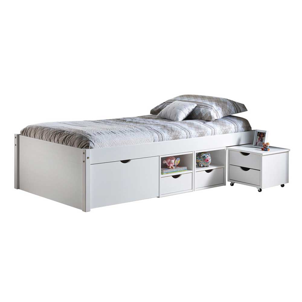 – Kinderbett Weiß – Kinderbettchen Kiefer Massivholz – Jungenbett Breite: 96 – Kinderzimmer bett Höhe: 48 – Bett für kinderzimmer Tiefe: 209 – Kinder einzelbett Bettseitenhöhe [Einstieg]: 48 – Holzkinderbett Inkl. 1 Nachtkommode – Bett fur kinder Liegemaße: 90×200 – Kinderzimmerbett Ohne Beleuchtung – Vollholzkinderbett Zerlegt, zum leichten Selbstaufbau (Montageanleitung liegt bei) – Mädchenkinderbett Lieferung ohne Matratze – Inkl. 1 x Rollrost – Fußende-Höhe (cm): 48 – Kopfende-Höhe (cm): 48 – Füße: Wangen an Kopf- und Fußende – Massivholz Oberfläche und LackiertInformationen zur Lieferung:Die Zustellung dieses Produktes erfolgt per Spedition. Sie werden vor der Auslieferung durch die ausliefernde Spedition kontaktiert.Terminvereinbarung: Sie werden frühzeitig (ein paar Tage im Voraus) durch die ausliefernde Spedition kontaktiert und Ihnen der Auslieferzeitpunkt mitgeteilt. Die Kontaktaufnahme erfolgt per Telefon. Bei telefonischer Nichterreichbarkeit werden Sie per Postkarte über das Auslieferdatum informiert.Die Lieferung erfolgt aus Kostengründen Frei Bordsteinkante (bis zur ersten verschlossenen Tür). Für den weiteren Transport der Ware sind Sie eigenverantwortlich.Die Auslieferung erfolgt von Montags bis Freitags. Eine Zustellung an Sonn- und Feiertagen ist nicht möglich.