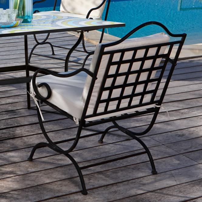 Die im Carrée verarbeiteten Eisenbänder geben dem Stuhl große Stabilität und gleichzeitig filigrane Eleganz. Bequem durch die Polsterauflagen.