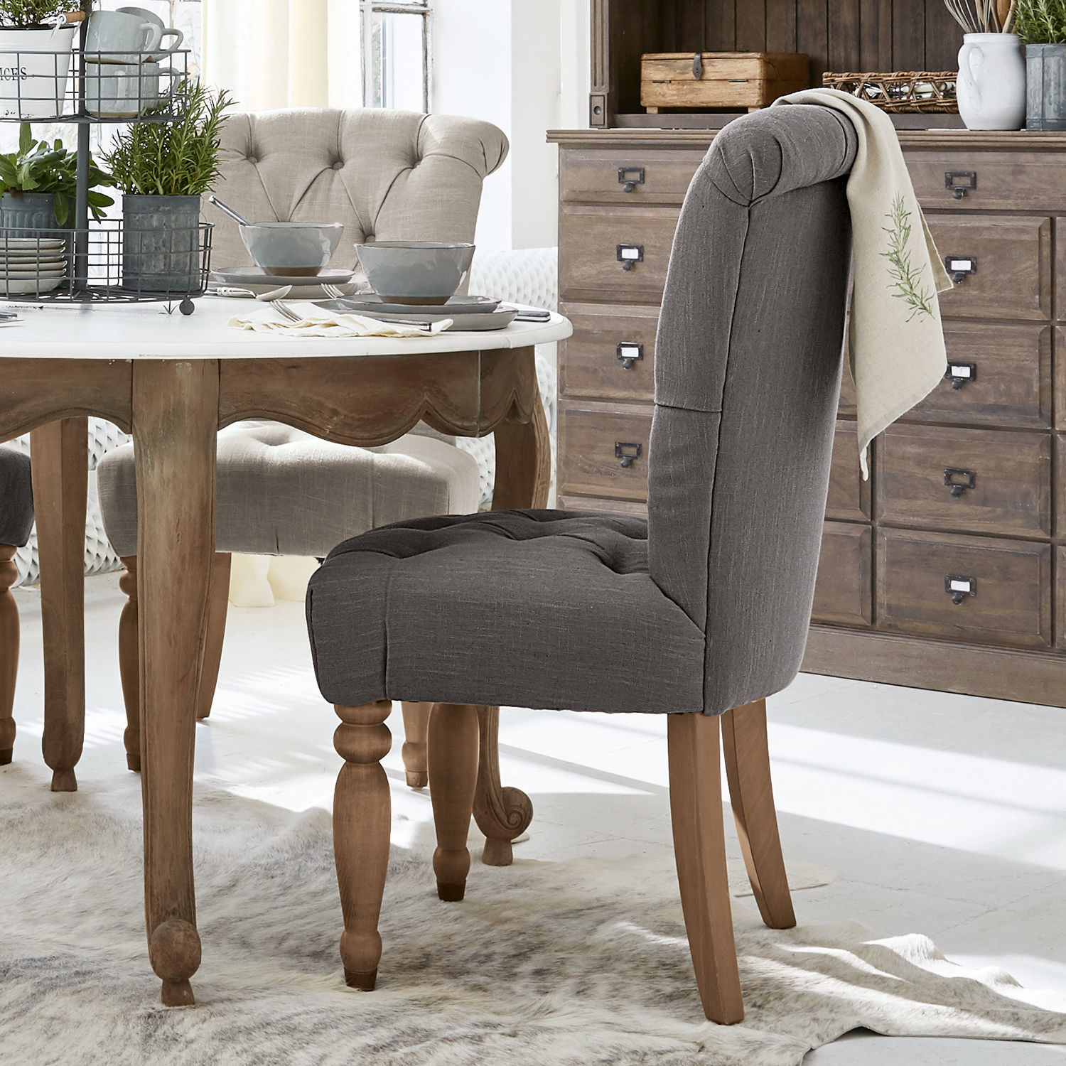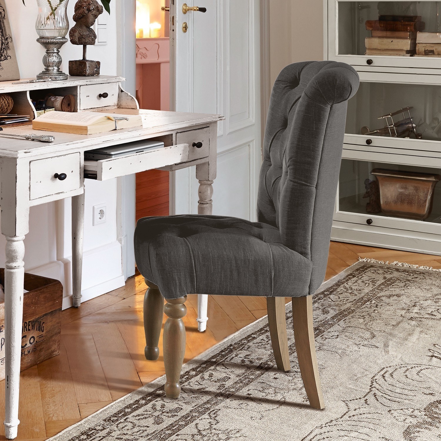Very british: Worauf stilbewusste Inselbewohner schon lange setzen, hat auch in Ihrem Zuhause einen Platz verdient, schließlich treffen bei diesem klassischen Polsterstuhl ausgesuchte Materialien auf höchsten Sitzkomfort. Die kapitonierte Sitzfläche bietet dank der Polsterung aus festem Schaumstoff und hochwertigen Kunstfasern langlebiges Sitzvergnügen. Die sanft abgerundete Form wird durch den hellen Bezug aus strapazierfähigem Leinen-Viskose-Gemisch elegant hervorgehoben – auch die aufwendig gearbeiteten Füße aus Kiefernholz kommen so besonders gut zur Geltung. Ob als Solist oder Teil einer eleganten Tafelrunde: Dieser Stuhl bietet Ihnen überall stilbewusste Rückendeckung.