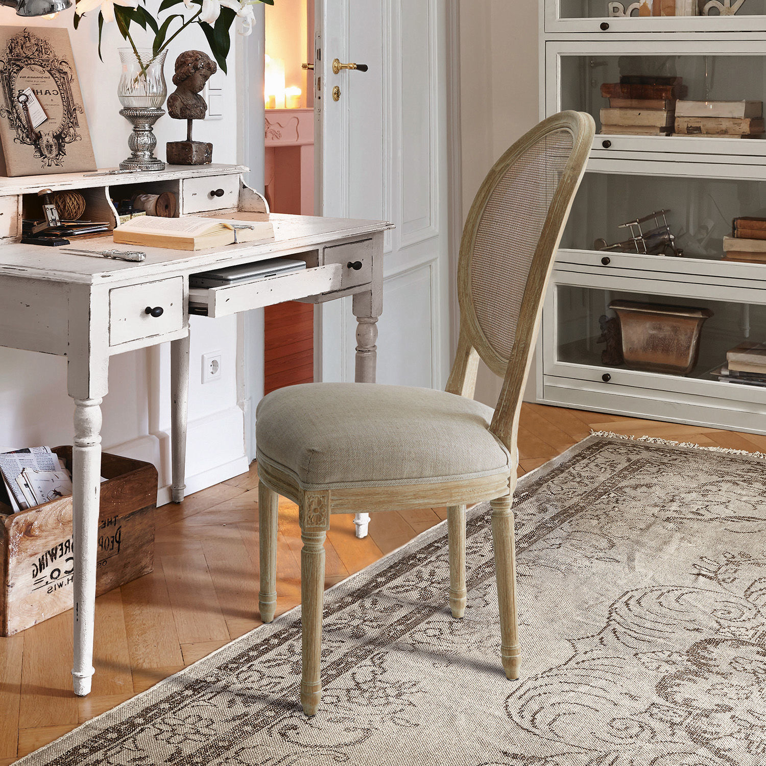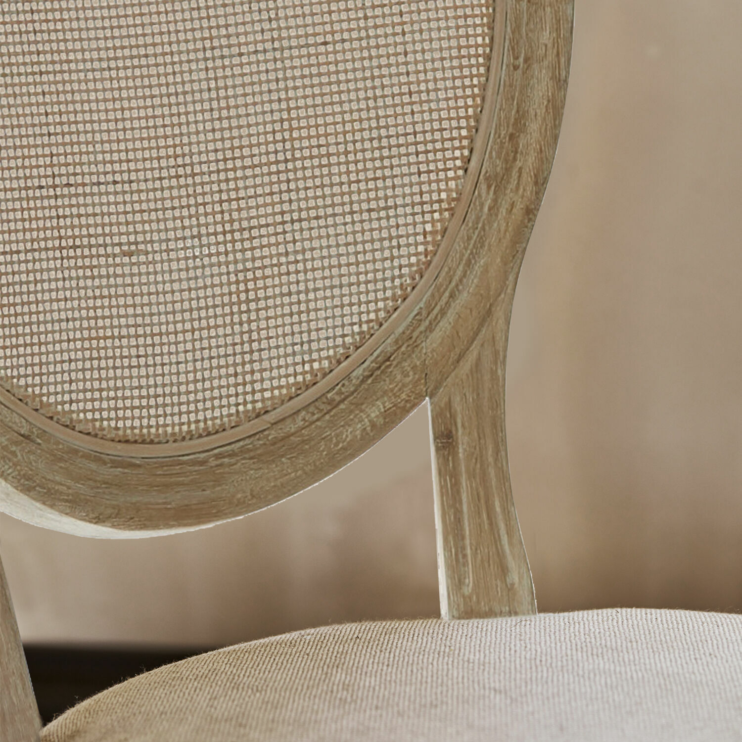 Dieses Möbelstück wird schnell zum Liebling im Hause, denn Komfort und Design lassen gewiss keine Wünsche offen. Der Medaillonstuhl im klassischen Stil passt ganz hervorragend zu vielen Einrichtungsstilen wie Landhaus-Stil, französisch angehauchtem Chic oder zum klassisch gehaltenen Wohnstil mit eleganten Möbeln und Accessoires. Das Gestell ist aus sehr langlebigem Eichenholz gefertigt und ansprechend verarbeitet. Hervorzuheben ist ebenfalls die hübsche Maserung, die das Naturmaterial ziert und seine ursprüngliche Schönheit betont. Die Sitzfläche ist äußerst komfortabel gepolstert, perfekt für lange Dinner-Abende oder ausgedehntes Frühstücken am Wochenende. Bespannt ist die Fläche mit einem schönen und hochwertigen Bezug aus Leinen. Dieser ist in einem ansprechenden Naturton gehalten, der sehr hervorragend mit dem hölzernen Gestell harmoniert. Die Lehne ist mit einem Geflecht bespannt, die den Rücken angenehm stützt und gleichzeitig den Charme des Stücks unterstreicht. Ob an einem massiven Holztisch, zur edlen Natursteinplatte oder zu einem zeitgenössischen Tisch aus Glas und Chrom – dieses Schmuckstück lässt sich hervorragend kombinieren und verleiht einfach jedem Raum einen besonders charmanten Touch.
