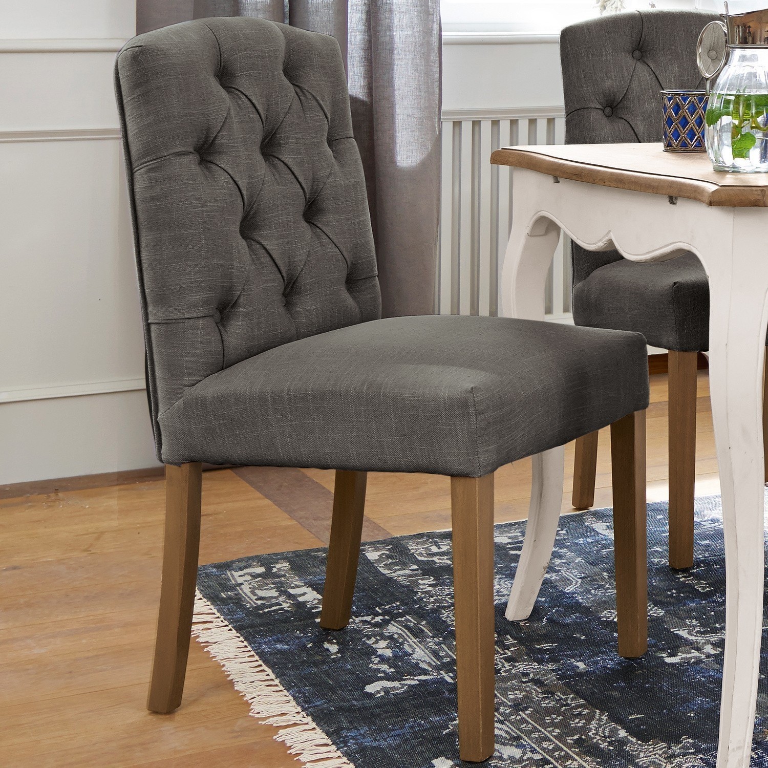 Dieser Stuhl überzeugt als zeitlos-eleganter Klassiker – vor allem im Esszimmer oder Salon. Die komfortabel gepolsterte Rückenlehne ziert eine Knopfsteppung im Chesterfield-Look. Die dunklen Massivholzbeine aus Buche und eine robuste Unterkonstruktion – ebenfalls aus Echtholz – unterstreichen noch den zeitlosen Charme dieses hochwertig verarbeiteten Sitzmöbels. Der Bezug: Ein pflegeleichtes Material, das kleine Klecker-Malheure nicht allzu krumm nimmt. Wir empfehlen in einem solchen Fall die Reinigung mit einem Microfasertuch und ein wenig lauwarmer Seifenlauge.