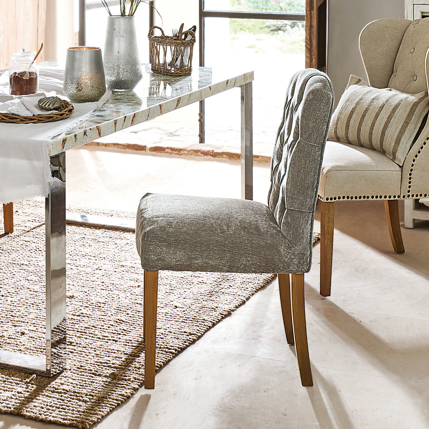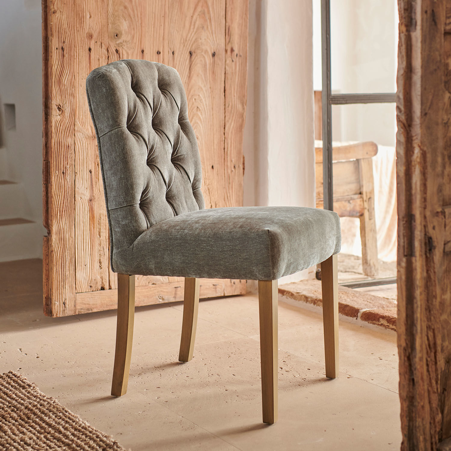 Dieser Stuhl überzeugt als zeitlos-eleganter Klassiker – vor allem im Esszimmer oder Salon. Die komfortabel gepolsterte Rückenlehne ziert eine Knopfsteppung im Chesterfield-Look. Die dunklen Massivholzbeine aus Buche und eine robuste Unterkonstruktion – ebenfalls aus Echtholz – unterstreichen noch den zeitlosen Charme dieses hochwertig verarbeiteten Sitzmöbels. Der Bezug: Ein pflegeleichtes Material, das kleine Klecker-Malheure nicht allzu krumm nimmt. Wir empfehlen in einem solchen Fall die Reinigung mit einem Microfasertuch und ein wenig lauwarmer Seifenlauge.