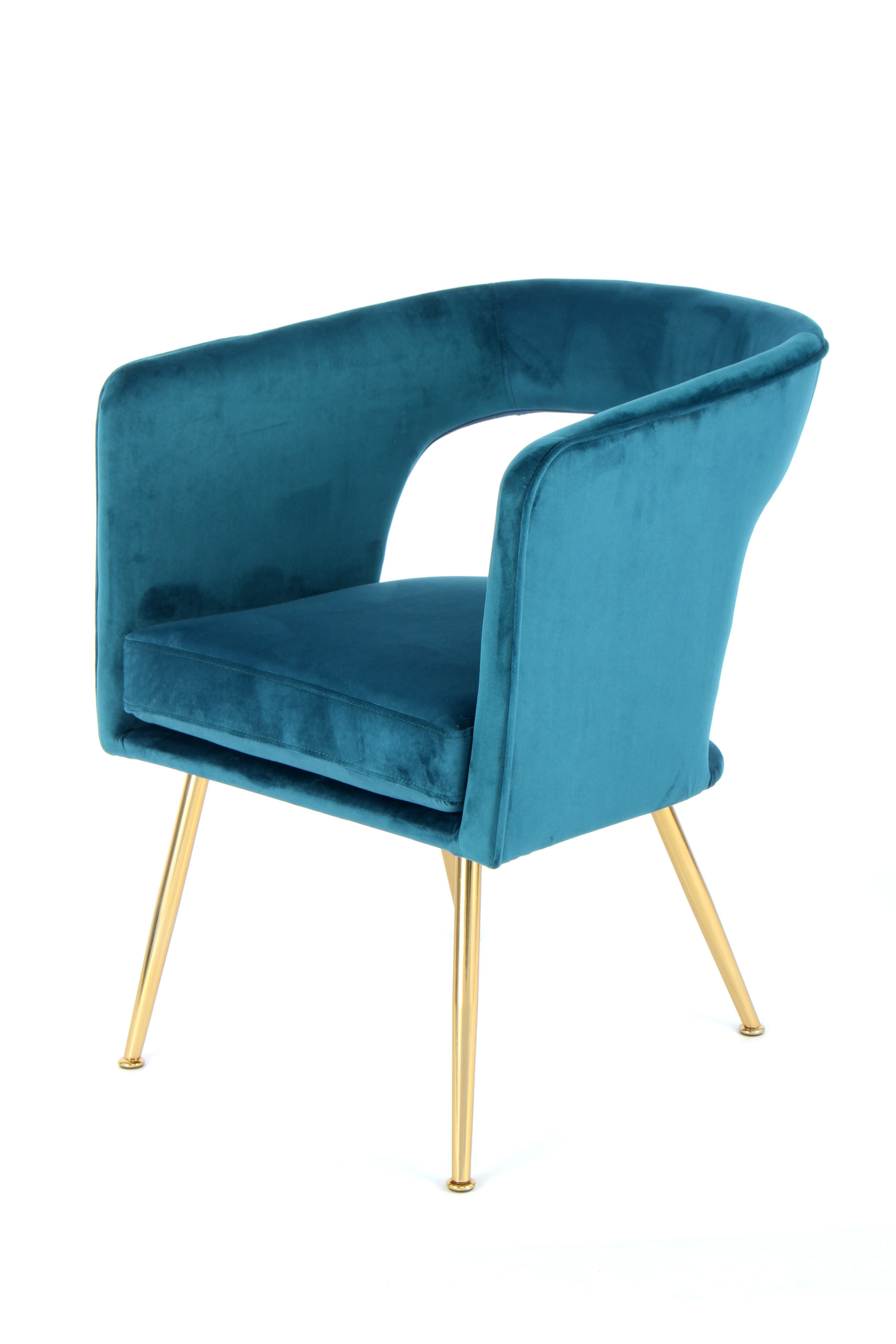 Dieses Stuhlmodell ist zeitlos und vermittelt dennoch einen Retro-Charakter. Die würfelförmige Grundform wird durch abgerundete Kanten und Ecken und eine Aussparung in der Mitte der Rückenlehne zu einem besonderen Hingucker. Der samtweiche Bezug in unifarbener Gestaltung unterstreicht den Retro-Look des Stuhls ebenso wie die seitlich abgespreizten Stuhlbeine aus Metall. Für Sitzkomfort sorgen das dicke Sitzkissen sowie die Rückenlehne mit integrierten Armlehnen. Das Sitzkissen ist durch Klettverschluss mit der Sitzschale verbunden und ist an der Unterseite mit einem Reißverschluss versehen.