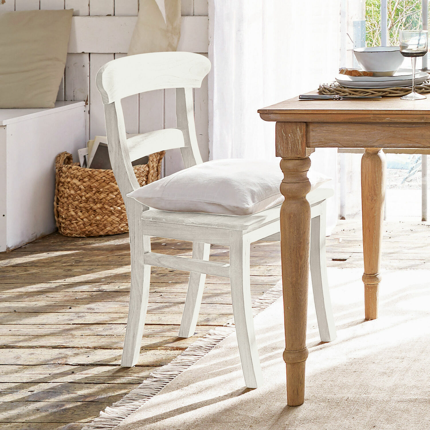Es ist immer wieder faszinierend, wie facettenreich sich der Landhaus-Stil in Szene setzen kann. Mal setzt er auf jede Menge schmückende Details, mal kommt er ganz schlicht daher wie dieser Stuhl. Und doch strahlt er immer dieses anziehende Gefühl von Wohnlichkeit und Geborgenheit aus, die so typisch für ihn ist. Sein besonderes Flair hat dieser Holzstuhl seinem Material zu verdanken. Er wurde sorgsam aus wiederaufbereitetem Teakholz gefertigt. Also aus einem Holz, das bereits auf ein früheres Leben – als Haus, als Boot oder als Möbelstück – zurückblicken kann. Und ein bisschen von dieser Ausstrahlung wird der Stuhl auch in Ihrem Wohnambiente verbreiten. Vor allem, wenn Sie mehrere dieser Stühle um den Esstisch gruppieren, werden Sie feststellen, dass jeder ein Unikat mit einer ganz eigenen Persönlichkeit ist. Das edle und zugleich robuste Teakholz wurde zum Schluss mit einem leichten Finish versehen, so dass der Stuhl perfekt zu naturfarbenen wie auch zu weißen Holztischen passt. Doch der Stuhl kann mehr als Ihnen, Ihrer Familie und den Gästen einen stilvollen Sitzplatz am Tisch bereithalten. Ein Holzstuhl wie dieser ist auch ein echtes Allround-Talent. Vielleicht bietet er Ihnen auch seine Dienste an, wenn Sie sich in der Küche beim Gemüseschnippeln hinsetzen möchten. Oder wenn Sie am Sekretär die Post durchsehen oder etwas aufschreiben wollen. Auch im Gästezimmer oder wo immer Sie eine ebenso praktische wie schöne Sitzgelegenheit brauchen, zeigt sich der Stuhl von seiner besten Seite.