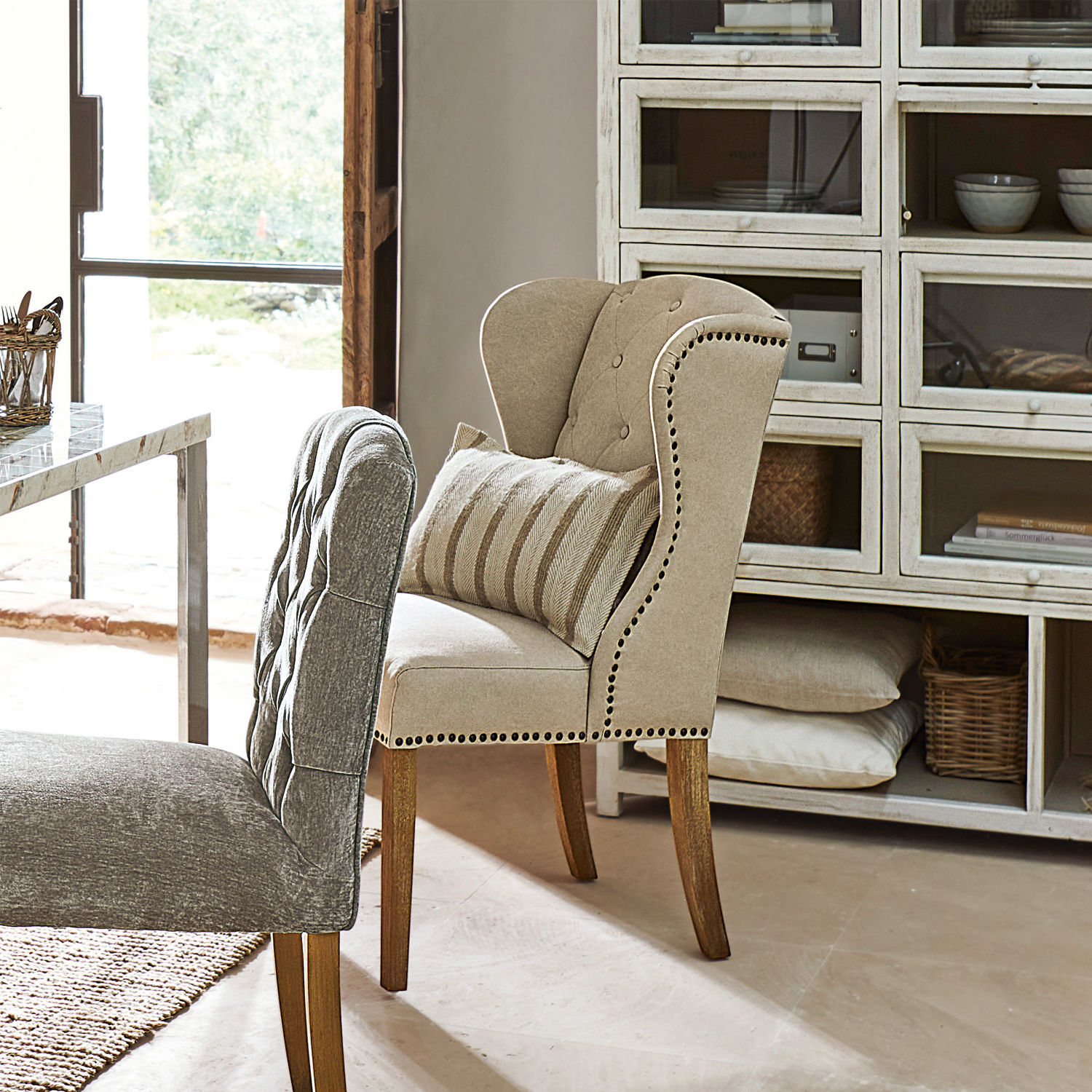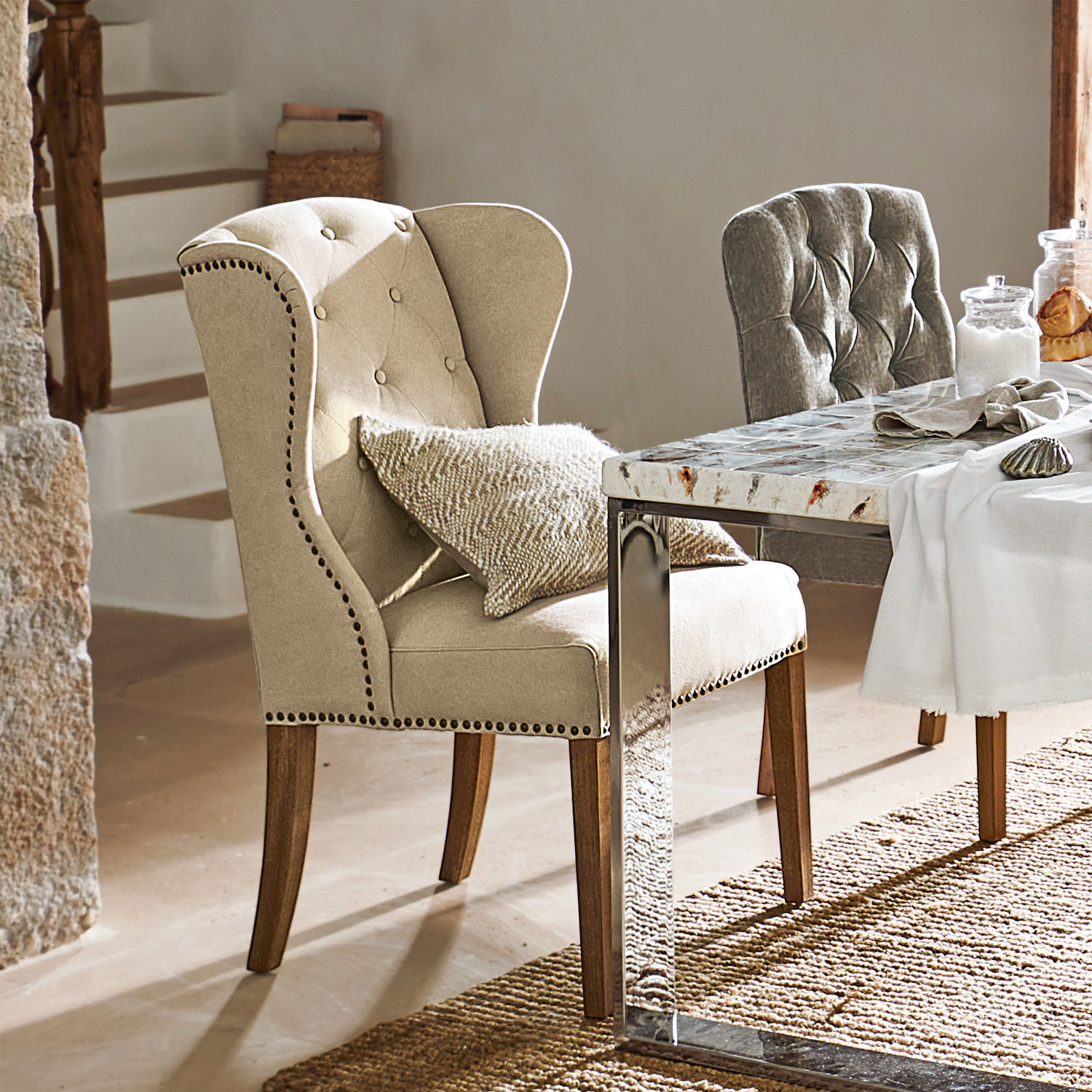 Wirklich gelungene Erfindungen kommen nie aus der Mode – wie der klassische Ohrenbackensessel. Anders als seine Vorfahren, die früher in Schlössern und noblen Landsitzen vor der Hitze des Kaminfeuers wie auch vor der kalten Zugluft schützten, passen sich die zeitgenössischen Exemplare mit kleinen Modifikationen unseren modernen Anforderungen an. Dieser Stuhl bietet nicht nur ein Sitzerlebnis de luxe, sondern hat genau die richtige Höhe, um am Esstisch platziert zu werden. Wie bequem die neuen Stühle sind, werden Sie daran merken, dass Ihre Gäste jedes Mal die Zeit vergessen und auch, wenn die Nacht schon fortgeschritten ist, immer noch gerne an Ihrer Tafel sitzen und Lust zum Plaudern haben. Für den exquisiten Sitzkomfort zeichnet sich die hochwertige Schaumstoffpolsterung zusammen mit den klassischen Sprungfedern verantwortlich, während das handgefertigte Gestell aus edlem Buchenholz dem Stuhl seine außergewöhnliche Stabilität und Tragkraft verleiht. Optisch tritt der Stuhl ganz in die Fußstapfen seiner historischen Vorbilder, von der typischen Formgebung über den Bezug aus weichem Polyestersamt bis zu den sorgsam per Hand aufgebrachten Knöpfen und Nieten. Was vielleicht überrascht und zugleich erfreut: Stühle wie dieser hier lassen sich erstaunlich vielseitig kombinieren. Sie passen zu rustikalen, dunklen Holztischen, wie sie in typischen Landhausküchen zu finden sind, sie ergänzen aber auch elegantere Tischmodelle.