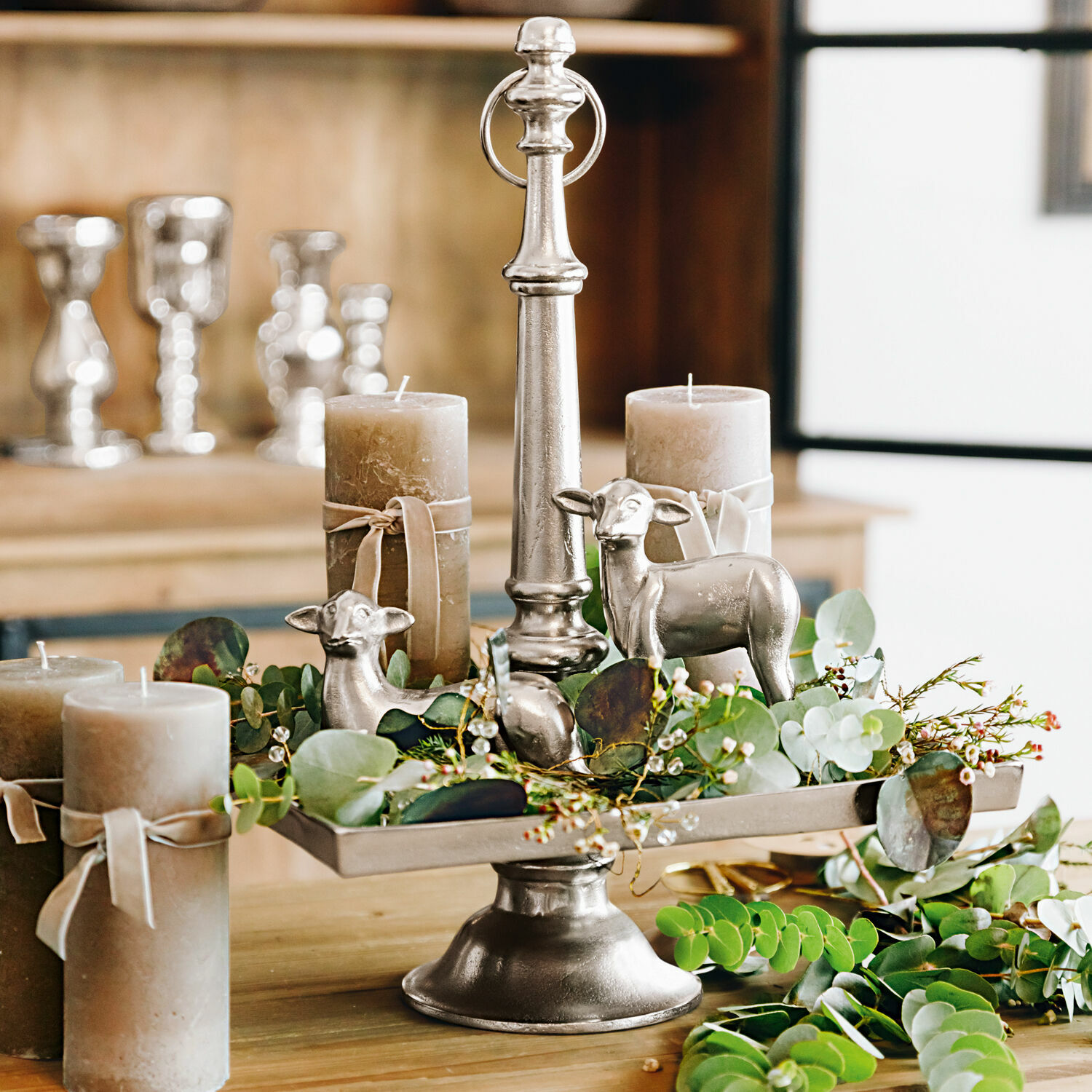 Sie wünschen sich einen luxuriösen und sehr ästhetischen Schmuck zu Ostern, der schon perfekt kombiniert zu Ihnen kommt? Dann ist dieses große und sehr harmonische Set die beste Wahl. Es besteht aus einer stilvollen Etagere, zwei niedlichen Osterlämmchen, einer sehr naturnahen Girlande sowie feinen Kerzen. All diese Schmuckstücke lassen sich wunderbar zusammen auf der Etagere arrangieren. Diese hat viel Vintage-Charme und besteht aus Aluguss mit Antik-Finish. Sie ist auch nach Ostern noch lange einsetzbar, etwa um Dekoratives oder kleine Leckereien darauf zu präsentieren. Beide Lämmchen aus Aluguss glänzen und sind in zwei Designs gefertigt. Die Kerzen sorgen für ein gemütliches Licht, sie sind von Hand gefertigt und ansprechend durchgefärbt. Und die Girlande ist sehr natürlich Magnolienblättern nachempfunden sowie in Handarbeit gefertigt und bemalt. Mit ihrem dünnen Eisendraht können Sie sie leicht formen und nach Wunsch drapieren. Nun ist es an Ihnen, all diese Lieblingsstücke auf der Etagere zu dekorieren – und schon können Sie sich auf einen individuellen und sehr charmanten Tischschmuck zum Osterfest freuen. Alle Teile des Sets können Sie natürlich auch einzeln oder mit anderem Schmuck arrangieren und so Ihr ganz persönliches Osterfest zelebrieren. Das Set besteht aus Etagere (12035), Kerze 4er Set (19679), Deko-Lamm 2er Set (20277) und Girlande (20129).