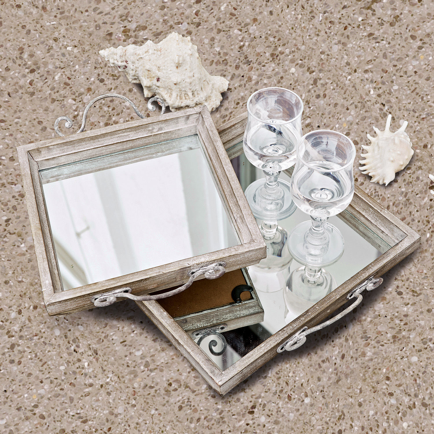 Bringen sie mit diesen verspiegelten Tabletts einen Hauch von Vintage-Glamour in ihr Zuhause. Das Set besteht aus zwei unterschiedlich großen Exemplaren, die mit einem einzigartigen Design punkten. Der Boden der Tabletts besteht aus verspiegeltem Glas, der Rahmen wurde aus Tannenholz gefertigt und die kunstvollen Griffe aus Stahl geformt. Beide Tabletts zeichnen sich durch eine sehr schöne Silhouette mit klaren Linien aus. Die Griffe fügen eine charmante, verspielte Note hinzu. Die Formsprache wirkt sehr klassisch, während der verspiegelte Boden Eleganz vermittelt. Bei Kerzenschein oder beim Tragen von hübschen Gläsern entfalten die Tabletts ihre volle Wirkung, denn das verspiegelte Glas streut das Licht im Raum und sorgt für eine echte Wohlfühlatmosphäre.