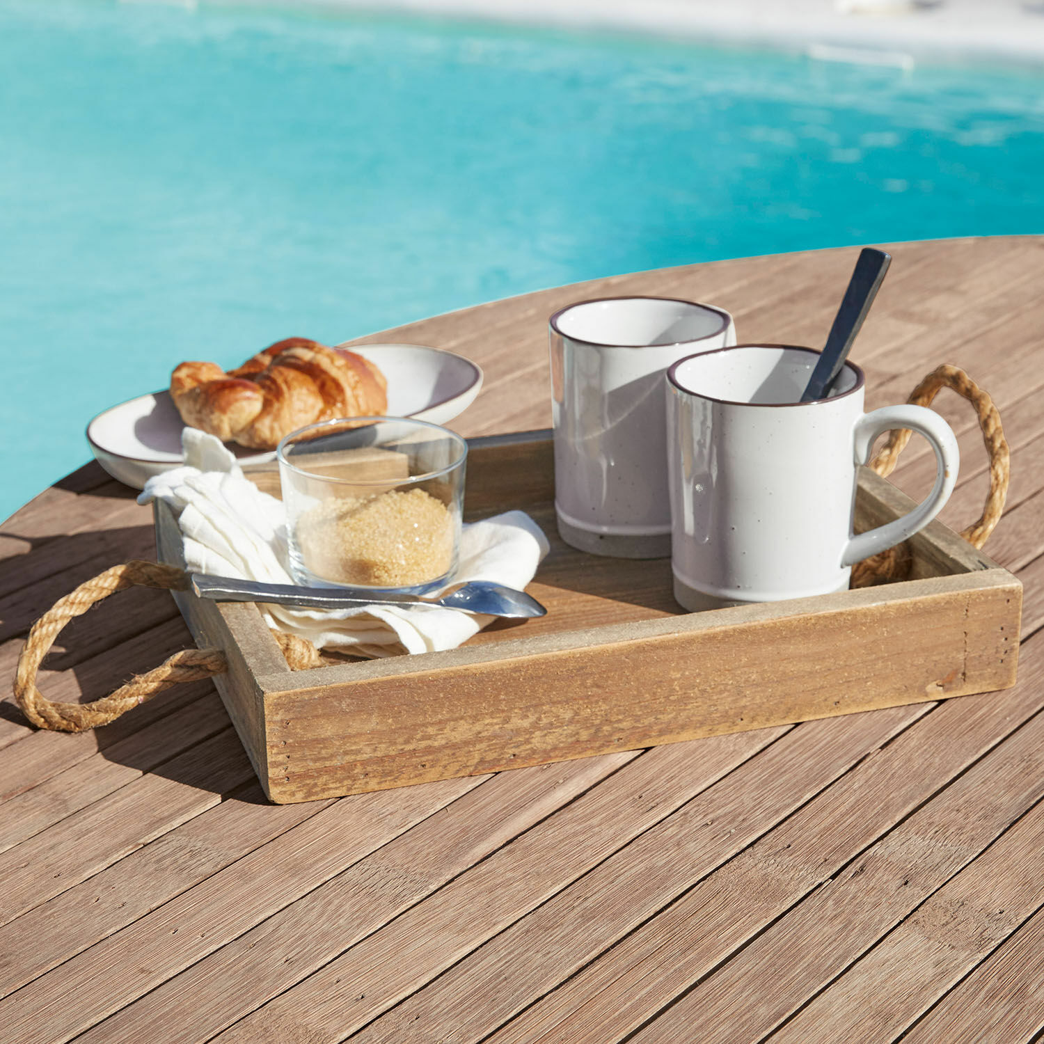 Eine elegante Porzellantasse mit Goldrand, dazu ein Croissant zum Frühstück auf einem weißen Tellerchen und ein Glas mit sprudelndem Wasser: Was auch immer Sie auf diesem charmanten Tablett servieren, es wird einfach wundervoll aussehen. Das schöne Schmuckstück hebt seinen Inhalt durch seine dezente Farbe besonders hervor. Dank seiner natürlichen Maserung und der Jute-Griffe wirkt es romantisch-rustikal und passt hervorragend zum Shabby Chic. Aber auch bei vielerlei anderen Stilen sieht es ganz entzückend aus. Es ist aus wiederaufbereitetem Tannenholz hergestellt und deshalb sehr umweltfreundlich. Servieren Sie damit Ihren Liebsten Frühstück ans Bett, präsentieren Sie Häppchen beim Brunch auf dem Balkon oder reichen Sie Gästen bei Feiern Getränke damit. Das Tablett ist dank seiner handwerklichen Optik der heimliche Star zu jeder Saison und macht an Ostern, im Urlaub und an Weihnachten eine gute Figur.