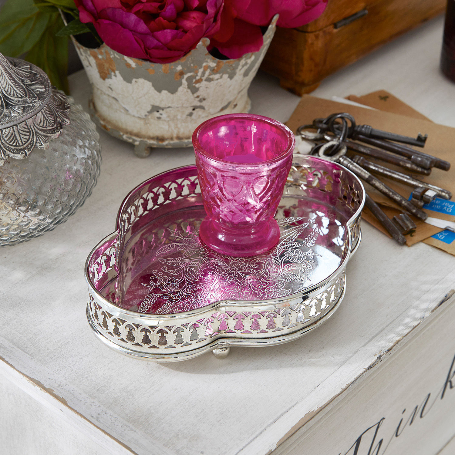 Träumen Sie von den blühenden Gärten von Marrakesch, von den vielen verwinkelten Gassen durch die Souks und von magischen Nächten über den Dächern der Medina? Mit diesem traumhaft schönen Accessoire aus glänzendem Messing können Sie einen Hauch des Orients in Ihrem Zuhause willkommen heißen. Das kunstvoll gestanzte Muster und die klassisch orientalische Formgebung machen das Stück zu einem traumhaft schönen Hingucker. Verwendungszwecke gibt es viele. Zum Servieren von erfrischenden Getränken wie kühlendem Minztee eignet sich dieses traumhafte Teil ebenso gut wie für viele kleine Teelichter oder eine hübsche Vase. Auch an die Wand gelehnt oder in der Küche verleiht es dem Raum einen einzigartigen Zauber wie aus 1001 Nacht.