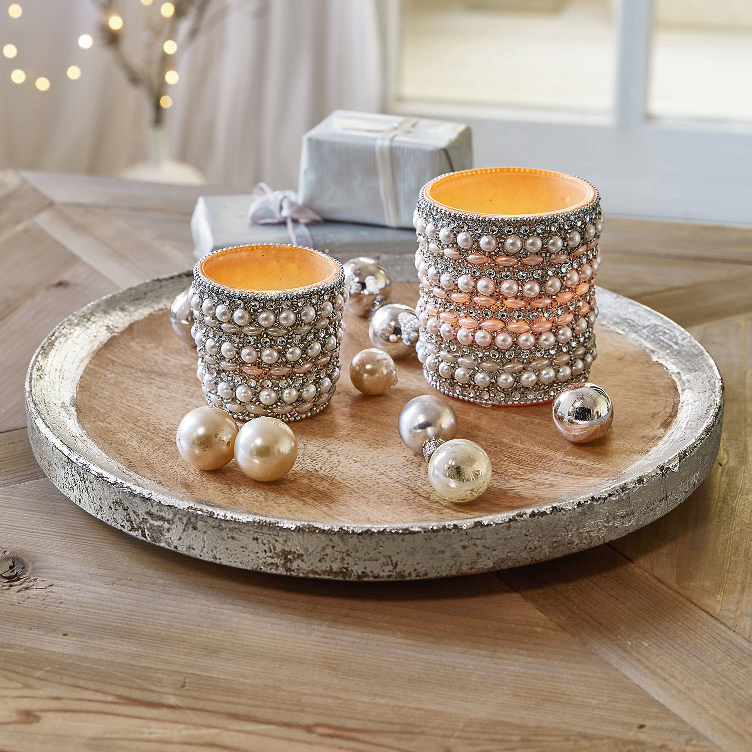 Auf diesem stilvollen Tablett aus Mangoholz können sie wunderbare Dekorationsideen arrangieren. Nur der Rand des Tabletts wurde in liebevoller Handarbeit mit einem silberfarbenen Finish überzogen, wodurch ein bezaubernder Kontrast zur naturbelassenen Schönheit des Mangoholzes entsteht. Diese Bemalung erhielt nachtrgälich noch ein hübsches Shabby-Finish, was dem ganzen Tablett eine romantischen Vintage-Note verleiht. Das Holz wurde lasiert, um die feine Oberflächenstruktur zu unterstreichen. Zur Weihnachtzeit können sie es mit Glaskugeln, Zweigen oder Kerzen schmücken, aber auch als alltägliche Dekoration lässt sich das Tablett vielseitig einsetzen.