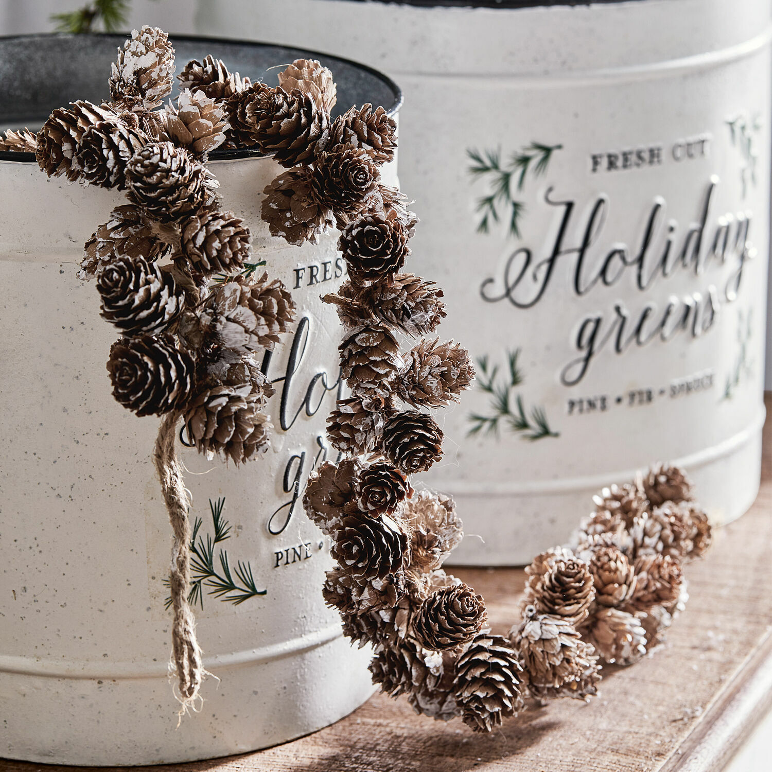 Natur pur und ein wunderbar winterlicher Akzent kommen mit dieser zeitlosen Girlande zu Ihnen. Echte Tannenzapfen und ein Hanf-Band gehen eine angenehm naturnahe Symbiose ein. Die Zapfen haben ein leichtes Schnee-Finish, sodass sie wie mit Puderzuckerschnee bestäubt aussehen. Schlaufen aus Hanf machen das Aufhängen ganz einfach, ob an zwei Haken oder um das Treppengeländer drapiert. Auch um eine Kaminkonsole geschlungen oder am Fensterbrett platziert sorgt die Girlande für eine festliche Atmosphäre. Mit Weihnachtsschmuck und Kugeln kombiniert oder ganz pur für nordisches Flair – hiermit können Sie kreativ werden. Ein Anblick, der Sie gedanklich in einen idyllischen Winterwald entführt und die kalten Tage versüßt. Wer möchte, kann sich den gesamten Winter über an dem geschmackvollen Design freuen. Es harmoniert mit vielen Wohnstilen und ist zudem dank der ganz natürlichen Materialien auch umweltfreundlich.