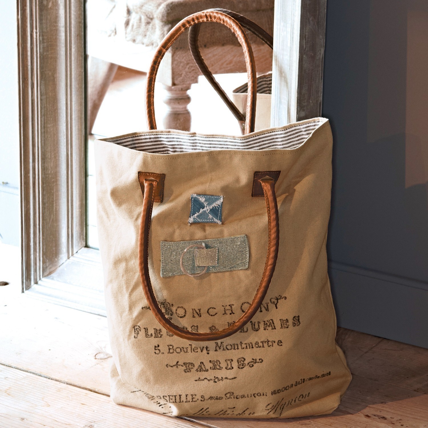 Wir lieben Taschen! Und diese hier ganz besonders: schön geräumig macht sie dank der robusten, widerstandsfähigen Baumwolle so einiges mit – mit genug Platz für Bikini, Badetuch oder den Einkauf auf dem Wochenmarkt. Der beigefarbene Stoff ist mit Applikationen besetzt und zudem in Handarbeit mit einem Print in Stempel-Optik versehen. Ein zusätzlicher, toller Eyecatcher: Das gestreifte Innenfutter. Die langen Henkel aus dunkelbraunem, echtem Leder sind fest auf der Baumwolle angebracht und sogar noch einmal extra verstärktKurzum: Diese Tasche ist ein echter Allrounder für alle Lebenslagen!