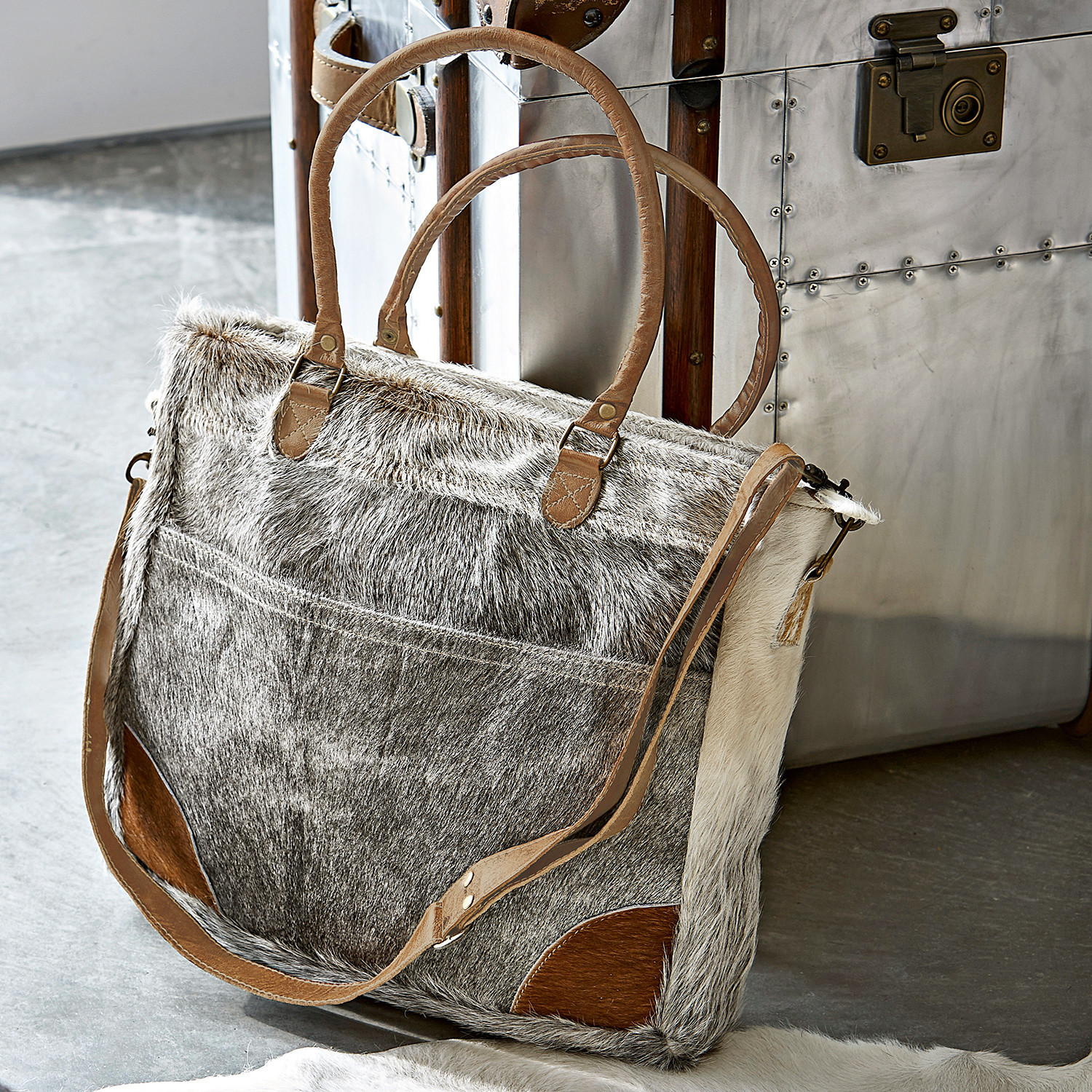Mit diesem Designer-Modell liegen Sie optisch genau richtig: Die außergewöhnliche Tasche ist aus Rindsleder. Jedes Stück ist mit seiner individuellen Haptik und Fellfärbung ein Unikat – eben ein echtes Naturprodukt. Planen Sie eine Shopping-Tour oder einen Ausflug in das nächste Café? Sie können in Ihrer neuen Handtasche die wichtigsten Utensilien auf jeden Fall übersichtlich verstauen und mit dem eingenähten Reißverschluss leicht öffnen. Mit der charmanten Optik der hochwertigen Umhängetasche punkten Sie zusätzlich. Tragekomfort bietet Ihr Begleiter mit seinem Schulterriemen aus Büffelleder. Zusätzlich dazu gibt es noch fest vernähte Taschenhenkel und verstärkte Kanten, ebenfalls aus echtem Leder. Die cremeweißen und hellbraunen Farbtöne des Rindsleders harmonieren wunderbar miteinander und geben der Tasche einen trendigen Touch.