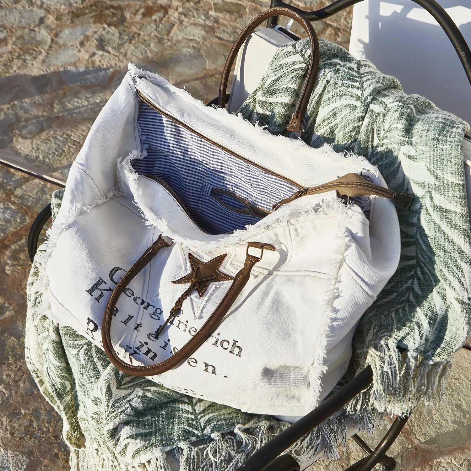 Diese modische Tasche ist wirklich der beste Begleiter für sommerliche Tage. Sie ist großzügig gestaltet und passt zu vielen Outfits, von Jeans bis Sommerkleid. Das helle Gewebe aus reiner Baumwolle ziert ein interessanter Vintage-Print. Die Henkel bestehen aus hochwertigem Büffelleder – ein reizvoller natürlicher Material-Mix. Das hübsche und dekorative Sternchen auf der Vorderseite bezaubert mit süßen Zier-Schlüsselchen. Die Kanten sind raffiniert ausgefranst, was den Look besonders lässig und casual macht. Das Innenfutter ist blau-weiß gestreift, eine kleine Innentasche bietet Raum für das Handy. Diese schicke Tasche ist sehr gut für den Stadtbummel oder einen Tag am See geeignet.