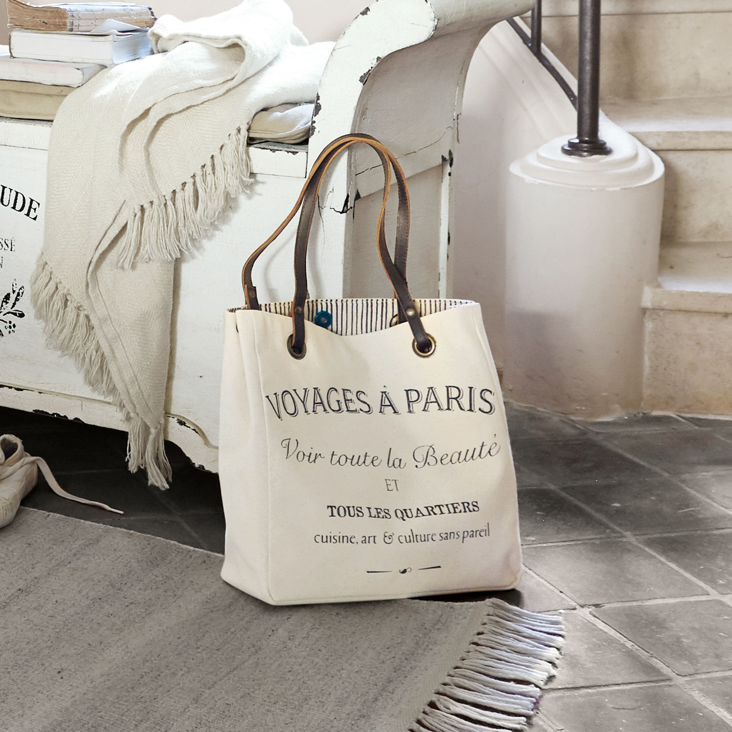 Diese Tasche ist der ideale Begleiter für Ihren Alltag. Das zeitlose Design punktet mit schlichter und unaufdringlicher Eleganz, die perfekt mit unterschiedlichsten Outfits harmoniert. Sie ist aus hochwertiger Baumwolle robust gewebt und mit einem französischen Vintage-Print veredelt (Text: Reise nach Paris, um seine Schönheit zu erblicken). Die Henkel aus Büffelleder sind angenehm weich und bilden farblich einen attraktiven Kontrast. Die geräumige Tasche verfügt über einen Reißverschluss und ein diskretes Innenfach, das groß genug ist für Handy, Geldbörse oder Schlüssel.