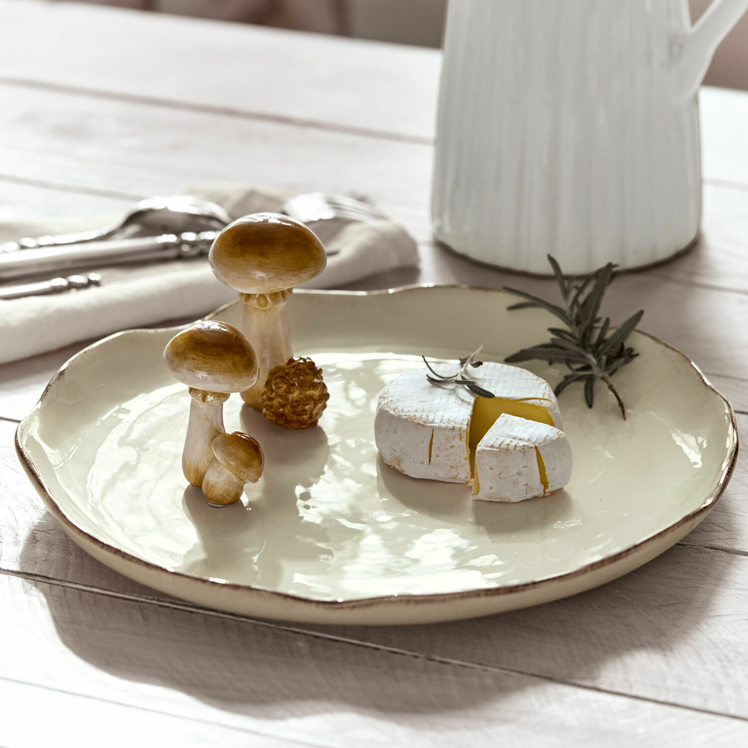 Wirklich sehr charmant – dieser edle Teller ist ganz reizend mit kleinen Deko-Pilzen verziert. So kommt die Natur sowie ein herbstlicher Hauch in Ihr Zuhause. Das Schmuckstück besteht aus feinem Steingut und eignet sich bestens für dekorative Arrangements, vielleicht mit Fundstücken aus dem Herbstwald. Auch Leckereien wie Obst und Gemüse lassen sich auf dem schönen Teller gut arrangieren, und wer mag, könnte auch Schmuck und andere kleine Dinge darauf verwahren. Erleben Sie eine Prise Landhaus-Flair und ein außergewöhnliches Design mit liebevoller Gestaltung – ein hübscher Tischschmuck mit besonderer Note.