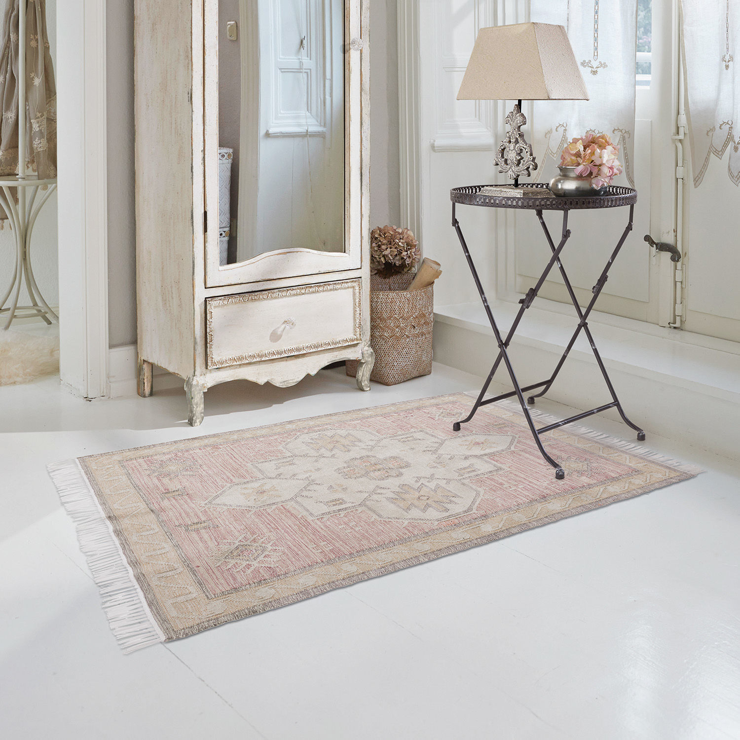 Nachhaltiges Wohnen spielt in modernen Zeiten eine immer wichtigere Rolle. Mit diesem Teppich aus wiederaufbereiteten PET-Flaschen leisten Sie einen aktiven Beitrag zum Schutz der Umwelt. Je nach Größe werden für ein Exemplar ca. 100 bis 750 wiederaufbereiteten Flaschen verwendet. Diese werden gesäubert, eingeschmolzen und durch Spinnmaschinen zu Garn verarbeitet. Aufwendig von Hand gewebt beeindruckt der Teppich durch sein wunderbares Vintage-Design und sein harmonisches Farbbild in dezenten Pastelltönen. Stilsicher ergänzt durch dekorative Fransenabschlüsse an den schmalen Kanten passt er ideal zum Shabby-Chic. Die wiederaufbereitete Kunststoff-Qualität ist in Optik und Haptik nicht weniger edel als natürliche Baumwolle. Jedoch macht die hohe Strapazierfähigkeit und Langlebigkeit diesen Teppich zu einem echten Allrounder für in- und outdoor. So setzt er nicht nur in Küche, Flur oder Badezimmer einen eindrucksvollen Akzent, sondern auch zu Ihrer gemütlichen Lounge auf der Terrasse.