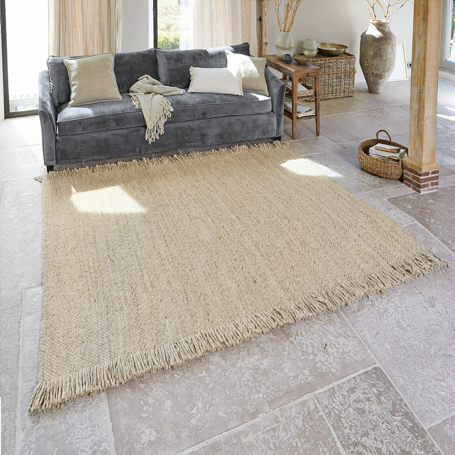 Geknüpft, gewebt, gewirkt oder getuftet – Teppiche haben eine lange Tradition in zahlreichen Kulturen und die verschiedenen Macharten und traditionellen Muster können uns viel über die Herkunft eines Teppichs erzählen. Im 21. Jahrhundert aber geht der Trend überwiegend zu dezent gemusterten oder monochromen Teppichen, die einen Raum nicht dominieren, sondern die verschiedenen Wohnstile erst richtig zur Wirkung bringen. Deshalb ist dieser schlicht elegante Teppich ein echter Trendsetter, der Ihnen im Wohnraum ebenso wie im Speisezimmer oder im Schlafraum viel Gestaltungsspielraum bietet. Der Teppich wurde im klassischen Stil besonders dicht aus dem bewährten Wolle-/Baumwolle-Mix gewebt, wobei jede Naturfaser eine andere Aufgabe übernimmt: Die Wolle verleiht dem Teppich den besonderen Wohlfühl-Charakter, ist angenehm wärmend und dämpft die Schritte, während die Baumwolle die Stabilität und Strapazierfähigkeit des Teppichs erhöht. Durch den hellen Naturton lässt der Teppich auch dunklere Räume hell, freundlich und einladend wirken und verbreitet ein wohliges Wohngefühl. Die dekorativen Fransen an den Längsseiten runden das Gesamtbild stilvoll ab.