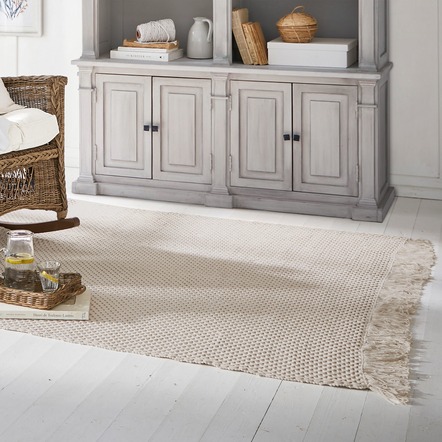 Ganz gleich, ob Sie einen Fußboden aus Stein, Holz oder Fliesen haben, mit einem Teppich gewinnt ihr Ambiente nochmals an stilvoller Wohnlichkeit. Und weil der Teppich aus einem weichen, angenehmen Naturmaterial wie Baumwolle gewebt wurde, werden Sie oftmals der Versuchung nicht widerstehen können, wieder mehr Zeit auf dem Fußboden sitzend zu verbringen. Um mit den Kindern zu spielen, mit dem Hund zu kuscheln oder um zu lesen oder Musik zu hören. Auch das Barfußlaufen ist wieder ein echter Genuss, denn die reine Baumwolle ist sehr weich und hautfreundlich und sorgt zugleich für ein angenehmes Raumklima. Und schließlich handelt es sich bei Baumwolle sogar um einen nachwachsenden Rohstoff, der auch biologisch abbaubar ist – ein Argument, das für viele Liebhaber des naturbetonten Landhaus-Stils immer mehr an Bedeutung gewinnt. Nicht zuletzt aber wird auch das attraktive, sehr plastische, wabenförmige Webmuster, das an beiden Enden vom klassischen Fransenabschluss begleitet wird, den Ausschlag dafür geben, Ihr Wohnambiente mit diesem Teppich zu krönen. Er verbreitet im Wohnraum wie im Schlafzimmer angenehme Behaglichkeit und passt mit seinem hellen Unifarbton auch zu den verschiedensten Wohnstilen – von modern bis rustikal.