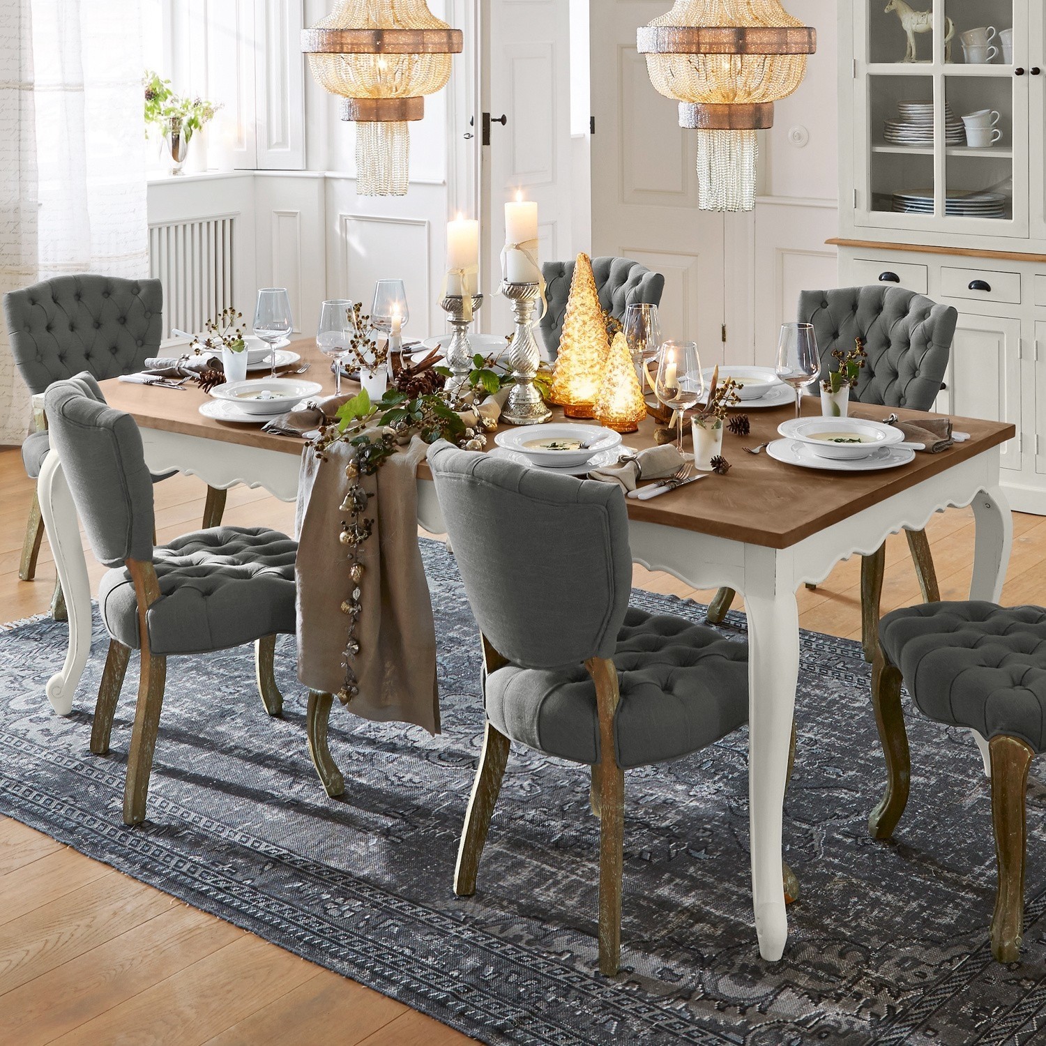 Bei diesem Esstisch ist der Name Programm, denn: „Bellevue“ bedeutet übersetzt nichts anderes als „schöne Aussicht“. Kurzum: Acht bis zehn Personen können an diesem Tisch im französischen Stil nicht nur den (hoffentlich) appetitlichen Anblick Ihrer aufgetragenen Speisen genießen, sondern auch den Blick über die hochwertige Verarbeitung des Möbels schweifen lassen. Der Hingucker: In die Tischplatte aus massivem Mangoholz wurden geometrischen Intarsien gearbeitet. Endgültig geadelt wird der Esstisch durch den weißen Antik-Lack auf den barock geschwungenen Tischbeinen aus echtem Mangoholz und der sanft gewellten Tischzarge. Der Esstisch „Bellevue“ passt daher ganz wunderbar zu einer Küchen- oder Esszimmereinrichtung im französischen Landhaus-Stil und zu all jenen Menschen, die nach etwas ganz Besonderem suchen. Nach einem Möbelstück, das nicht jeder hat. Einem Tisch mit Stil, Charakter und dem gewissen Etwas. Und all dies bekommen Sie mit dem „Bellevue“ jetzt quasi frei Haus geliefert. Nur kochen müssen Sie noch selbst. Oder auch nicht. An dem Look dieses Tisches können sich Ihre Gäste ja auch erst einmal satt sehen. Guten Appetit!
