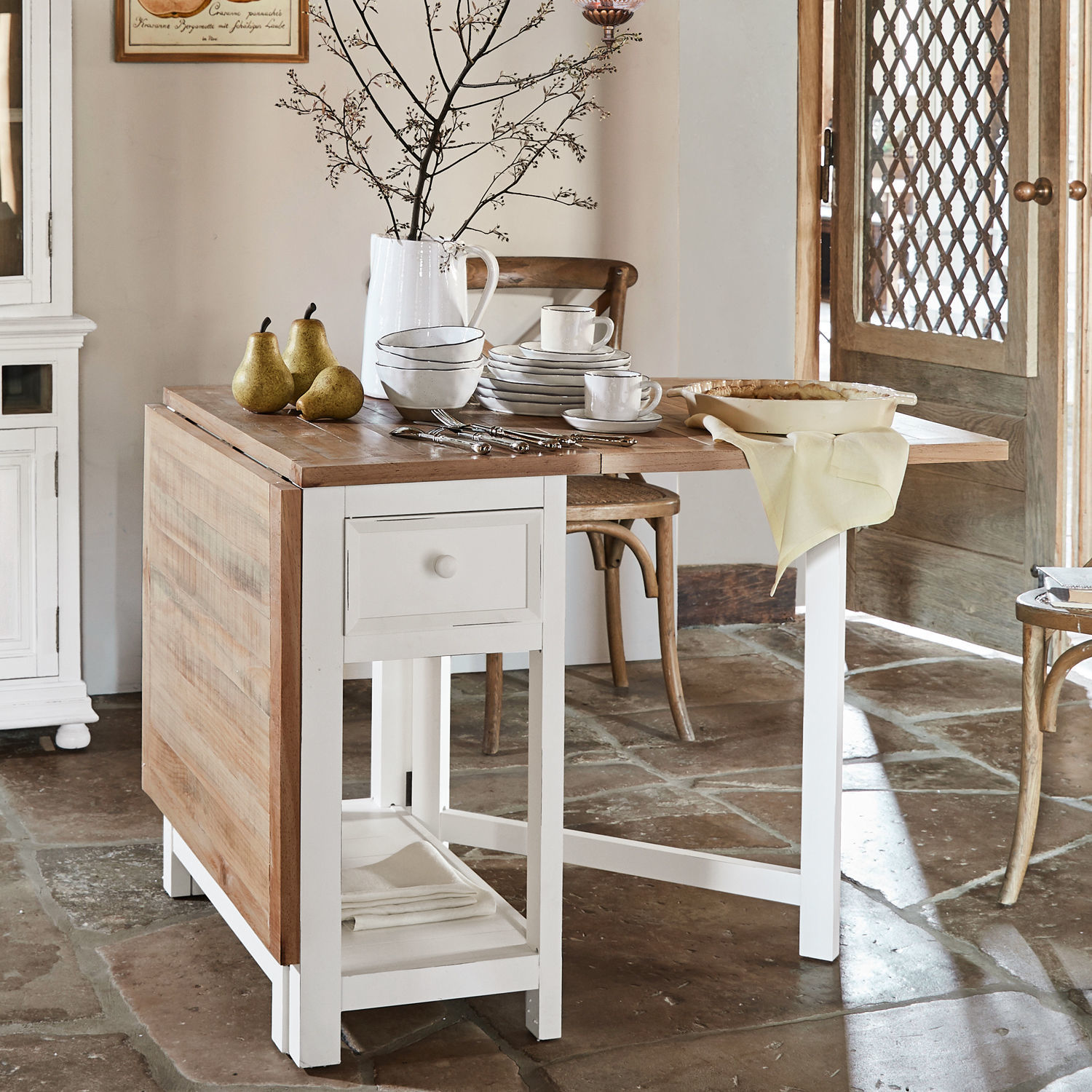 Sehr schöne Antik-Optik. Im Landhaus-Stil mit naturbelassener Platte und Gestell mit Antik-Finish. Mit ausklappbarer Platte auf beiden Seiten. Ein kleines […]