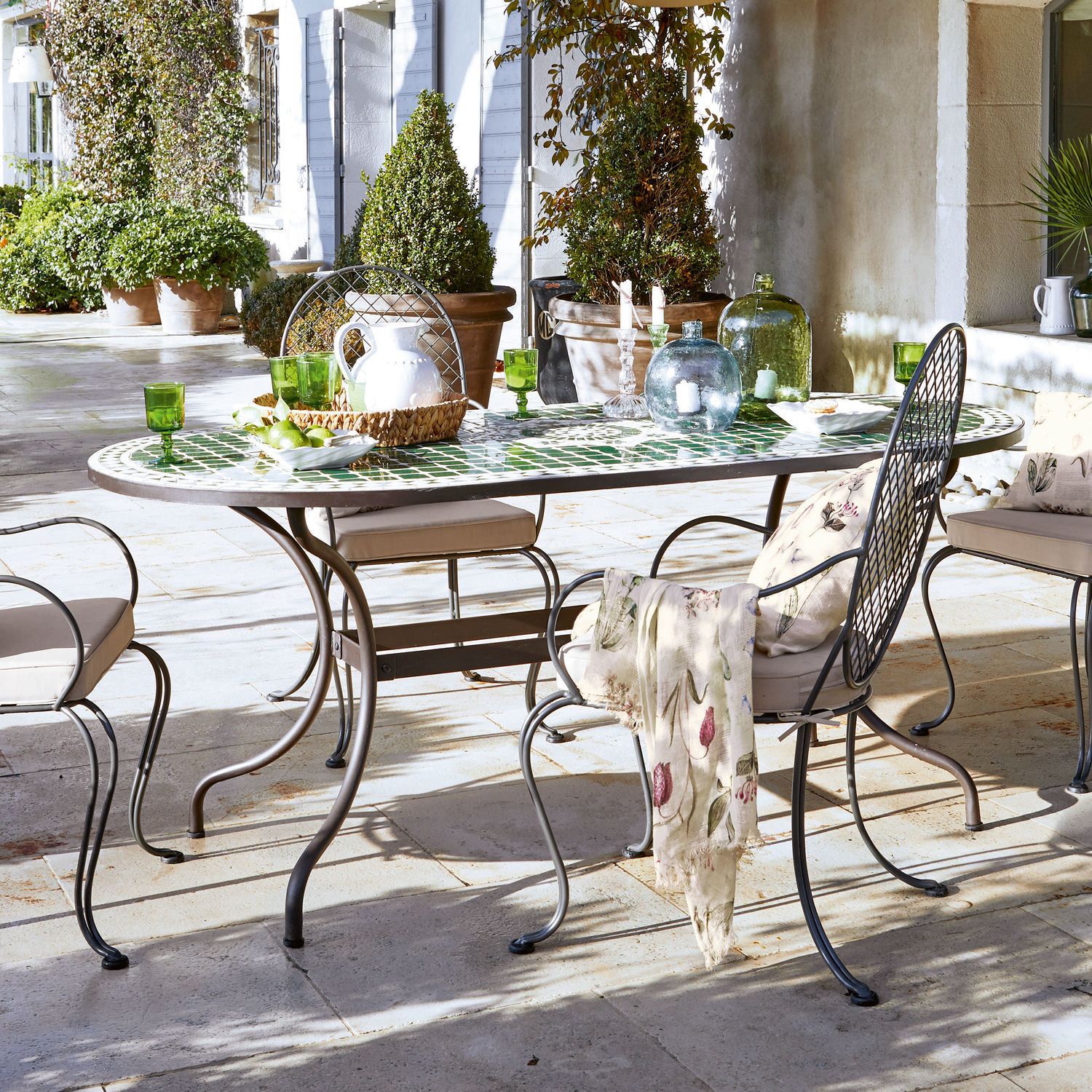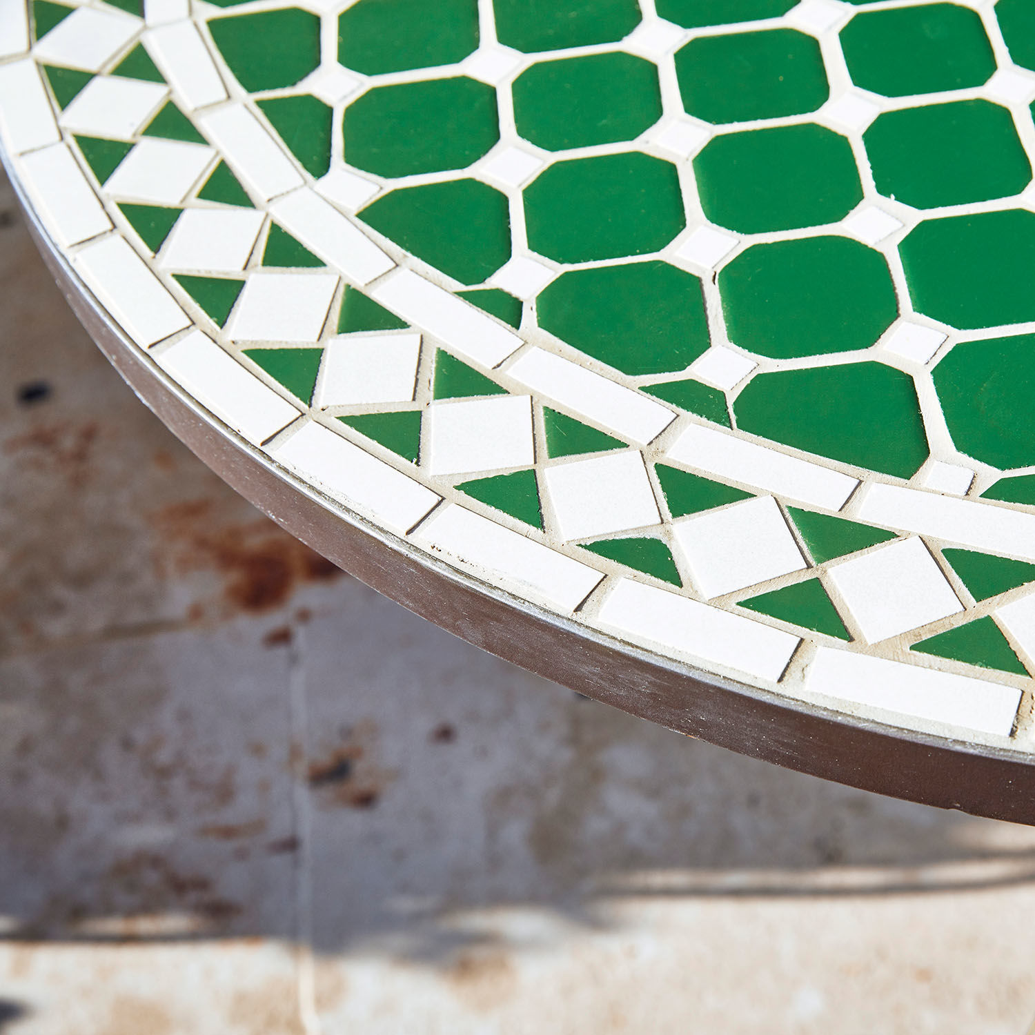 Ob im Patio eines andalusischen Stadthauses, auf der Veranda eines Landsitzes in der Provence oder im Garten einer römischen Villa – überall kann man erlesene Mosaiktische wie diesen finden, denn seit der Antike ist die Kunst des Mosaiklegens im Mittelmeerraum zu Hause. Und in jedem prachtvollen Mosaik vereinen sich mediterraner Lebensstil mit orientalischem Flair. Das Interessante dabei: Die alte Handwerkskunst wird immer noch im traditionellen Stil ausgeübt. Könnten Sie bei der Entstehung zuschauen, würden Sie sehen, wie der Künstler für diesen Tisch kleine, zuvor zurechtgeschnittene Fliesenteilchen nach einem kunstvollen Entwurf zu dem ausdrucksstarken, geometrischen Muster anordnet. Das Schwierige dabei: Er muss das Muster quasi von links legen und sieht das Ergebnis erst in Vollendung, wenn das Mosaik mit Beton fixiert und die Platte gedreht wird. Schließlich wird die Platte noch geschliffen und geputzt und mit einem Gestell aus pulverbeschichtetem Eisen ergänzt. Also ein aufwendiger und handwerklich wie künstlerisch anspruchsvoller Entstehungsprozess, der aber jeden einzelnen Tisch zu einem Unikat mit einer unverwechselbaren Handschrift macht. Und zu einem Schmuckstück, das Ihren Sitzplatz im Freien mit seinem ganz eigenen Flair verzaubert. Ob Sie den Tisch mit handgeschmiedeten Eisenstühlen kombinieren oder lieber in gemütlichen Korbsesseln sitzen ist ganz Ihnen überlassen – mit seinem kunstvollen Mosaik wird der Tisch immer strahlender Mittelpunkt Ihrer Sitzgruppe sein.