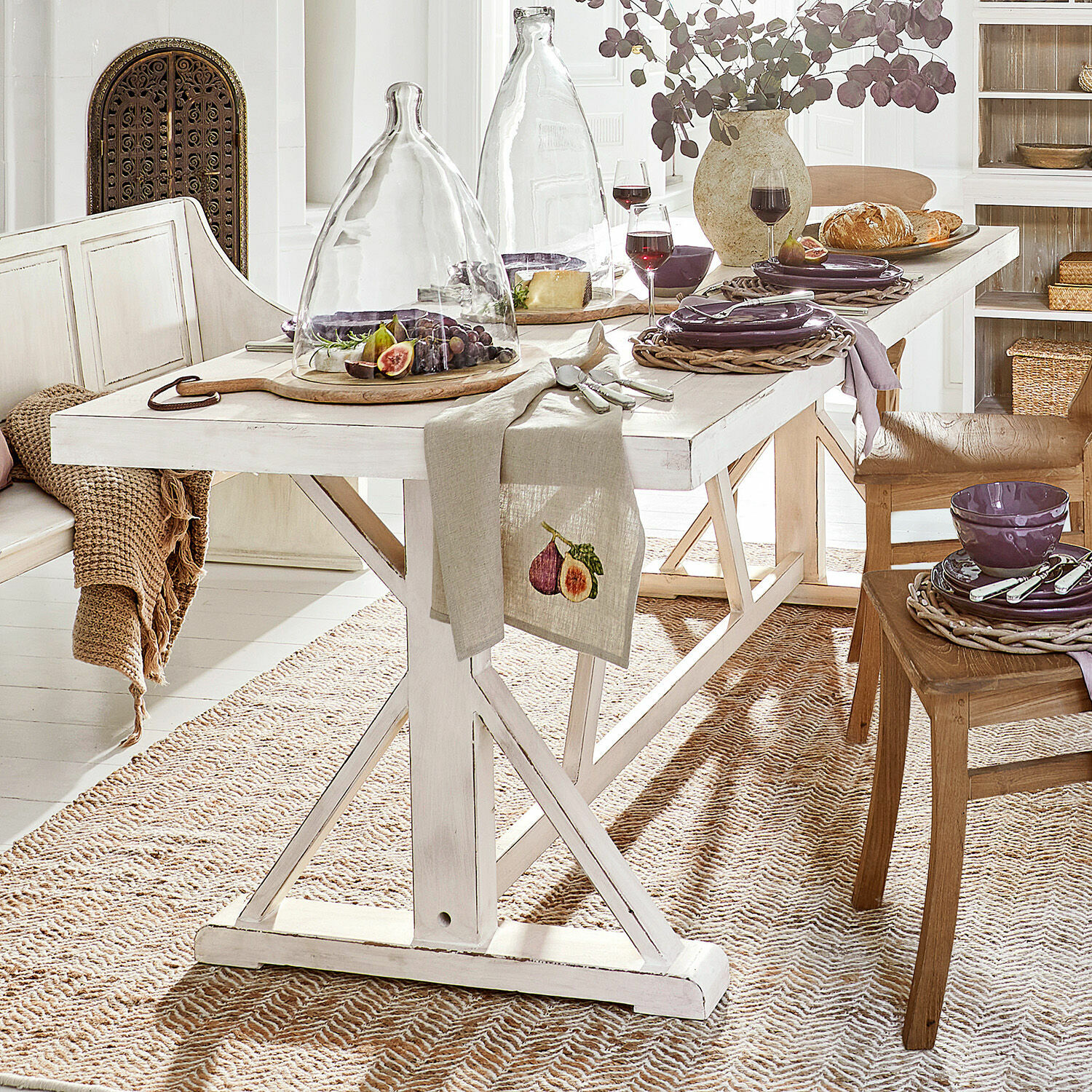 Kommt doch rein und nehmt gleich am Tisch Platz, das Essen ist jeden Moment fertig! Dieser freundlichen Aufforderung werden Ihre Freunde bestimmt gerne nachkommen, zumal Sie für Ihre kulinarischen Überraschungen bekannt sind. Und wenn dann ein Tisch wie dieser einladend im Raum steht, wissen Ihre Freunde, dass es wieder einer dieser besonderen Abende wird, von denen man im Freundeskreis noch lange reden wird. Aber nicht nur Sie selbst und Ihre Kochkünste, auch der Tisch leistet seinen Beitrag zum Erfolg des Abends, denn groß, stattlich und unkompliziert verbreitet er eine entspannte Wohlfühl-Atmosphäre im Raum. Wie man es oft bei Landhaus-Möbeln beobachten kann, ist es dem erfahrenen Handwerker auch bei diesem Tisch meisterlich gelungen, robuste Alltagstauglichkeit mit einem nicht alltäglichen Look zu verbinden. Ein Tisch, den dank des soliden Gestells so schnell nichts umwerfen kann und der mit seinem rustikalen Massivholz-Flair auch den Eindruck erweckt, als müsse man ihn nicht mit Samthandschuhen anfassen. Denn die dezente, antikweiße Lackierung lässt hier und da leichte Gebrauchsspuren erkennen, die dem Tisch neben dem nostalgischen Flair auch seinen individuellen Charakter verleihen.