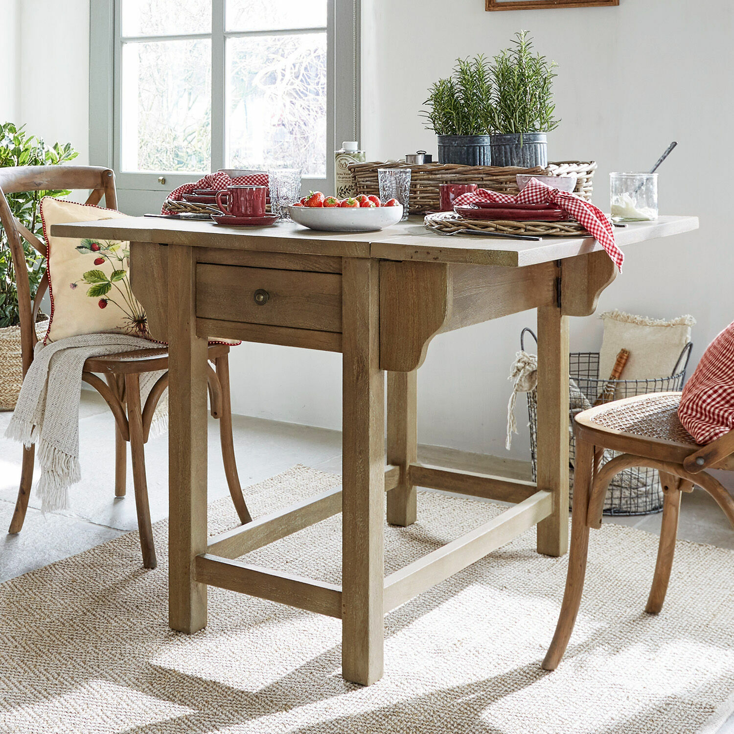 Anmut fürs Auge: Der schöne Tisch im nostalgischen Look vergangener Zeiten ist ein echtes Schmuckstück, das wunderbar platzsparend ist, denn seine Seiten lassen sich ganz einfach und komfortabel einklappen. Besonders schön: die feinen Maserungen und natürlichen Strukturen, die dem Mangoholz, aus dem der Tisch gefertigt ist, eigen sind. Ein weiteres Highlight bildet die hübsche Schublade, die für Ihre Schreib- oder Bastelutensilien, für Ihr Briefpapier, für Besteck oder für wertvolle Gegenstände genug Platz bereithält. Das einzigartige Antik-Finish rundet den charmanten Eindruck perfekt ab. Egal, ob Sie den Tisch zum Arbeiten, als Esstisch oder für Ihr Hobby nutzen – mit ihm wird jede Tätigkeit ein bisschen schöner, und natürlich auch Ihr Wohnambiente. Denn wer außer Ihnen hat schon so ein exquisites Möbelstück zuhause?